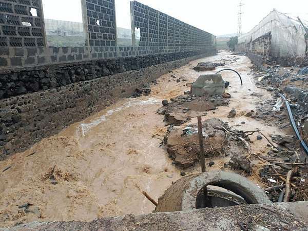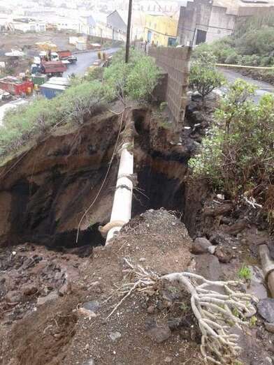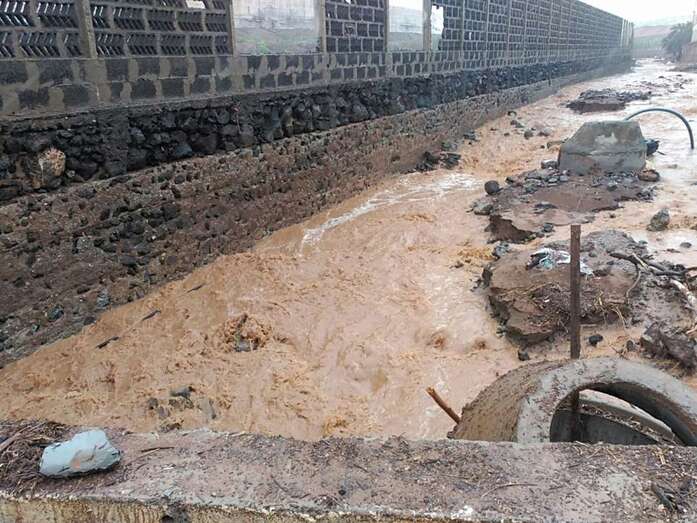 Como sucediera hace menos de una semana, el agua también ha vuelto a inundar la red viaria del municipio y a causar el desbordamiento de la red de saneamiento. Algunas viviendas se han visto afectadas por inundaciones y barranquillos como los del sector Melenara-Salinetas, ya llevan un considerable caudal de agua.