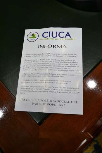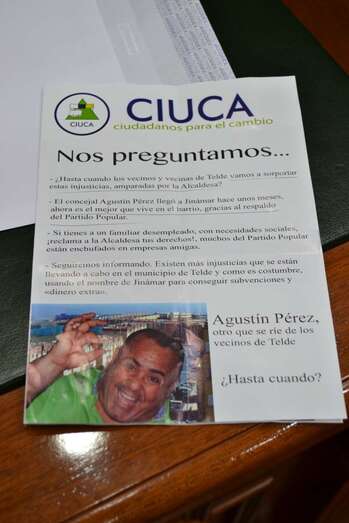 El tono de las acusaciones que lanza en este folleto la organización política que lidera Guillermo Reyes ha indignado al Partido Popular. La alcaldesa Mari Carmen Castellano no ocultó este viernes a TELDEACTUALIDAD su profundo malestar por el “panfleto” de Ciuca, que ojeó varias veces durante el desarrollo de la sesión plenaria, mientras que fuentes de su partido echaban en cara al partido de Reyes que ahora critique “cínicamente” la subida de impuestos y la actualización de la ordenanza de vados, “asuntos que fueron aprobados con los votos de los concejales de Ciuca”.