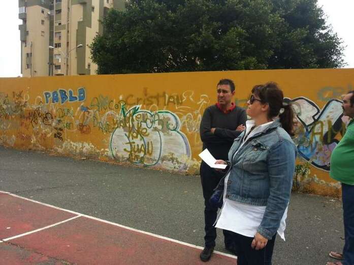 Los concejales también tuvieron ocasión de contemplar el lamentable estado del parque público, que carece de equipamiento de ningún tipo, como bancos o marquesinas, y cuya pavimentación está llena de malas hierbas mientras que las palmeras ofrecen una imagen desoladora, de total abandono por parte del servicio de Parques y Jardines .