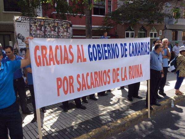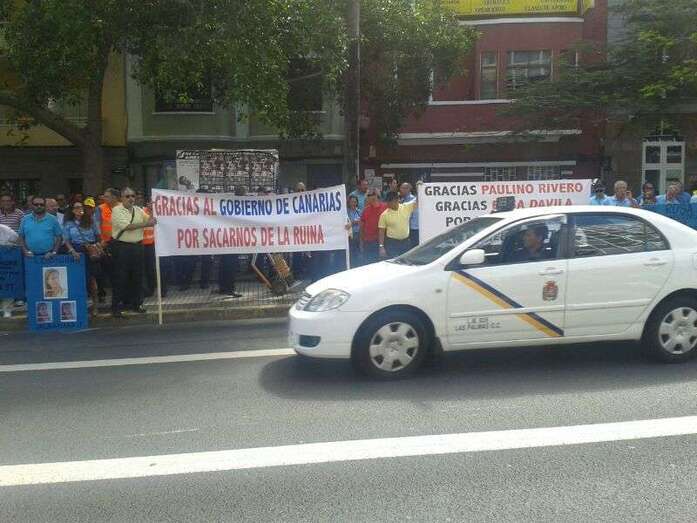 Los taxistas portan pancartas en las que se puede leer “Gracias al Gobierno de Canarias por sacarnos de la ruina”, en referencia al nuevo decreto que tiene previsto firmar el Ejecutivo regional, que endurece los requisitos para emitir un tránsfer. También llevan otra consigna que dice: “Gracias Paulino Rivero. Gracias Rosa Dávila por poner orden en el aeropuerto”.