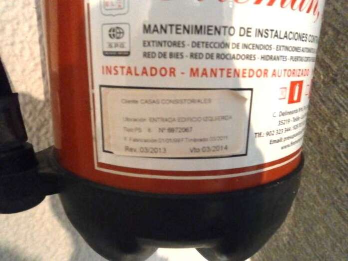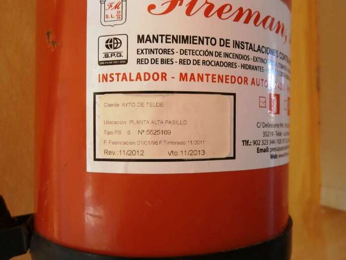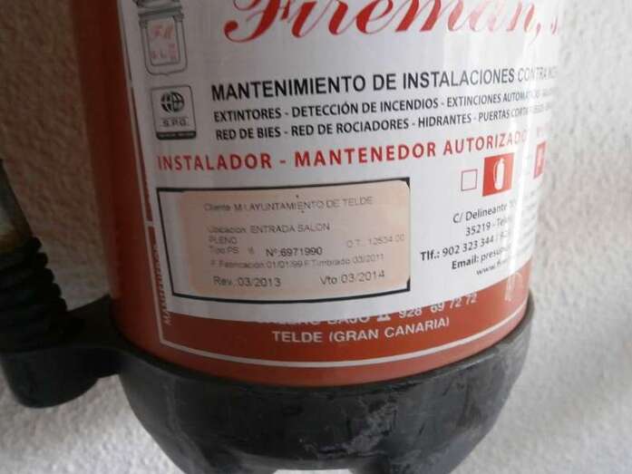 Fuentes del Gobierno local que preside Mari Carmen Castellano indicaron a este diario que el Consistorio ultima el expediente para la renovación del contrato de mantenimiento de los extintores, un trámite que se ha prolongado en exceso porque buena parte de los aparatos llevan caducados en algunos casos más de 12 meses. El que está en las inmediaciones del salón del Plenos y del despacho noble de la Alcaldía se revisión por último en el primer trimestre de 2013 y no ha sido recargado al cumplirse el año como determina la legislación vigente.