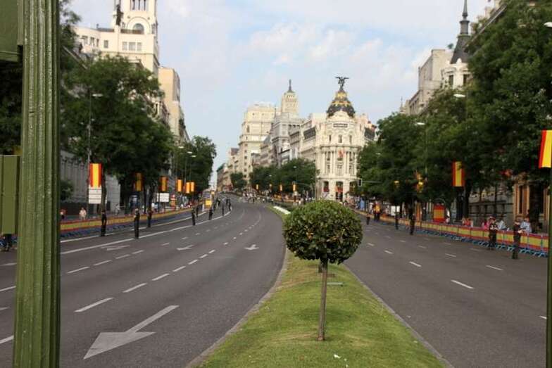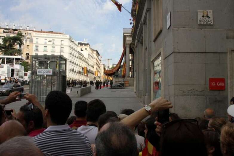 Escenas retransmitidas en directo que han llegado puntualmente a todo el mundo por la extraordinaria labor de los medios de comunicación y que se pudieron presenciar desde pantallas ubicadas en el exterior, como las instaladas en la Plaza del Callao. Esta corta crónica de un día para la historia de nuestro país, no la puedo cerrar del todo como quisiera, ya que al llegar a la Plaza de Oriente, para captar imágenes de la familia Real desde el balcón central de Palacio, después de cruzar con la mochila a cuestas y con bastante dificultad la calle Arenal, me encuentro que al llegar a la calle Carlos III, lateral del Teatro Real, la policía tiene los accesos cerrados por seguridad. La verdad es que el público acumulado en la Plaza de Oriente era enorme: no se podía dar un paso, por ninguno de los accesos.