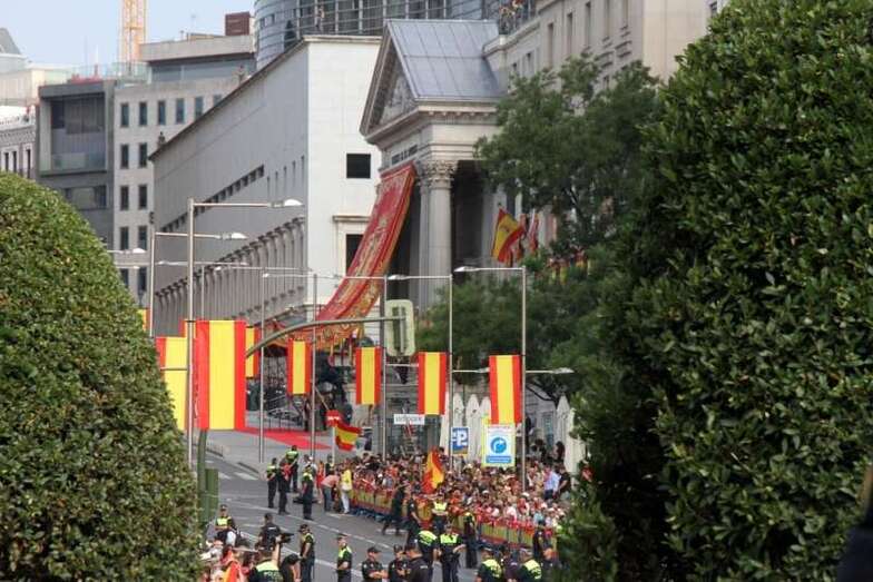 Desde la mañana de la proclamación sobre las 09:00 horas me desplazaba por el amplio escenario urbano donde se iban a desarrollar los principales actos, en torno al edificio del Congreso de Los Diputados, sin poder acceder a los espacios próximos, ya que se afirma y puedo asegurar que hubo un despliegue policial enorme. Las calles contiguas al itinerario de la comitiva real hasta el Palacio de Oriente estaban controladas y no se permitía el acceso, se cerraron al tráfico de usuarios las estaciones de metro de Sol y Banco de España; zonas de aparcamientos públicos, áticos y terrazas de edificios contiguos con vigilancia constante, las vías del recorrido real con hileras de agentes del orden, guardias civiles, policía nacional, municipal, militares. Una demostración de las Fuerzas de Seguridad del Estado que han garantizado, desde luego, el éxito de seguridad de la operación Orbe, pensada para este importante acontecimiento real en el marco del emblemático, urbano, histórico, turístico, en suma, del corazón de una de las capitales más importantes de la Europa Comunitaria, y del mundo.