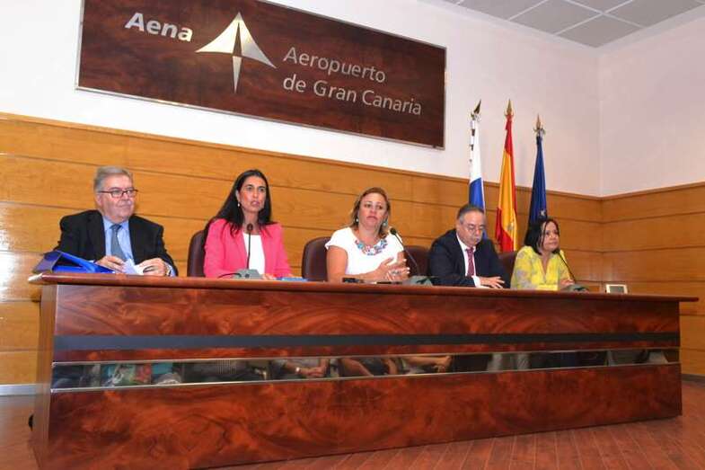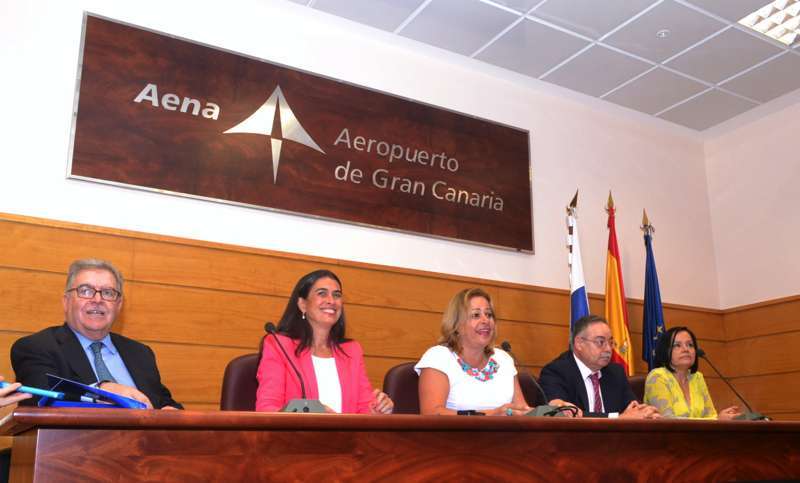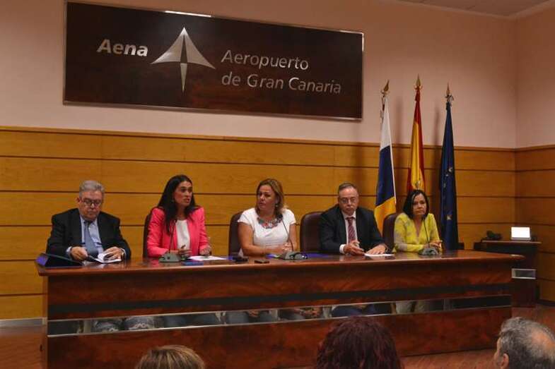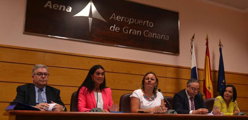 Mari Carmen Castellano, escoltada a ambos lados por Hernández Bento y Berriel y en los extremos por Bravo de Laguna y Margarita Alonso, presidía la mesa de la convocatoria en la que no compareció el presidente de Aena. Una ausencia que la delegada del Gobierno en Canarias justificó aseverando que ella, como emisaria del Estado, asumía la representación de la empresa pública.