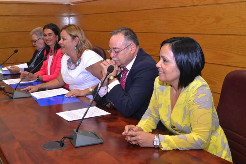 Las autoridades canarias y Margarita Alonso posan alegres y aliviados tras la firma del convenio (Foto TA) Las autoridades canarias y Margarita Alonso posan alegres y aliviados tras la firma del convenio (Foto TA)