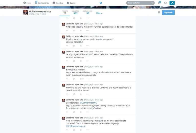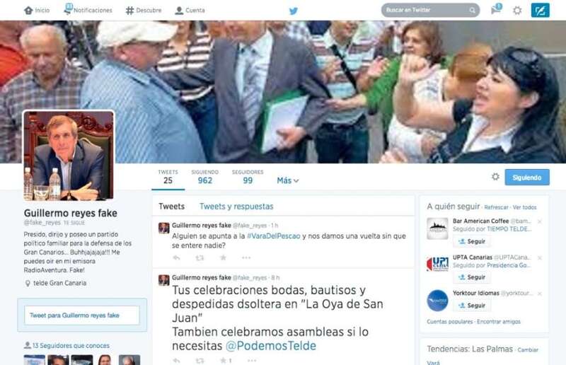 No obstante, el álter ego virtual de Guillermo Reyes, con foto del político teldense, parece no terminar de pillarle el tranquillo a la red social que encarna el conocido pajarillo azul, por lo que ha reclamado la ayuda de la alcaldesa “Maricarme” para localizar el expediente de la sucursal de tuiter en Telde.