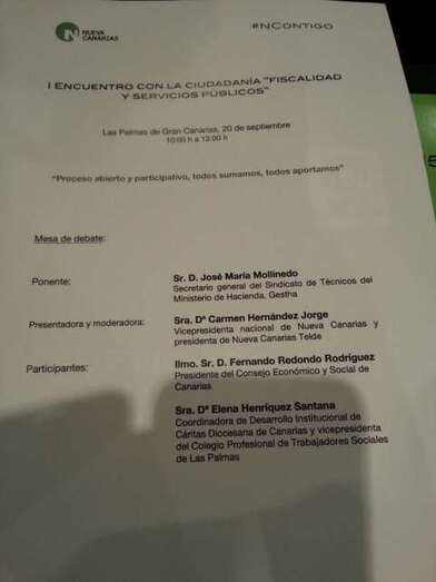 Tras algo más de tres horas, expertos y ciudadanos, reunidos en el recinto ferial de Las Palmas de Gran Canaria, concluyeron que es “necesario” revisar el modelo fiscal estatal y canario para que sea “más justo, progresivo y para pague todo el mundo y que pague más el que más tiene”, tal y como indicaron la moderadora y vicepresidenta del partido y el presidente de NC, Carmen Hernández y Román Rodríguez.