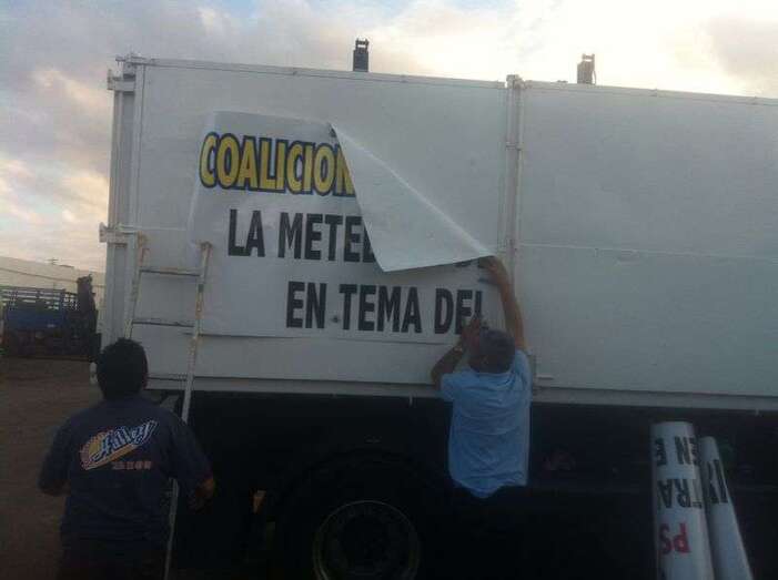 Para ello también han empleado un camión en el dejan patente su especial indignación contra los consejeros teldenses del PP Francisco Santana y Antonio Hernández Lobo, a quienes achacan el haberles traicionado al votar, junto al resto de su grupo, a favor de la propuesta.