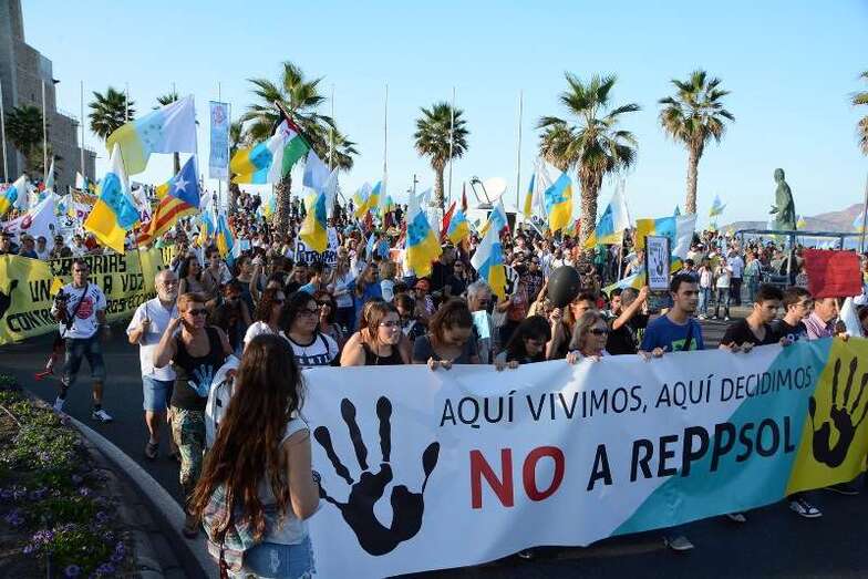 Miles de personas han vuelto este sábado a salir a las calles en todas las Islas Canarias, en manifestaciones simultáneas en contra de las prospecciones petrolíferas y a favor de que un asunto como este sea decidido por el pueblo canario en una consulta. "Aquí vivimos, aquí decidimos. No a Reppsol" ha sido el lema de estas marchas convocadas por una treintena de organizaciones ecologistas sociales, sindicales y políticas agrupadas en el Movimiento Canario contra las Prospecciones Petrolíferas.