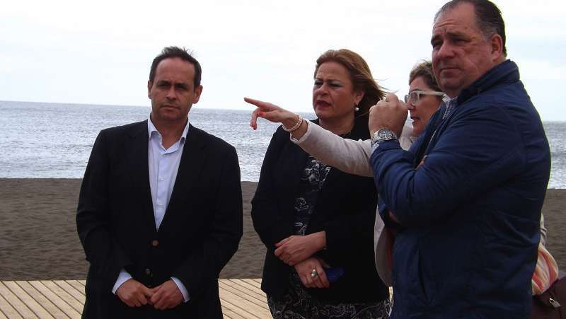 La alcaldesa de Telde, Mari Carmen Castellano, junto al consejero de Cooperación Institucional, Antonio Hernández Lobo, y a los concejales de Playas y Vías y Obras, María Calderín y Juan Martel, respectivamente, inspeccionaban esta mañana las actuaciones de accesibilidad.