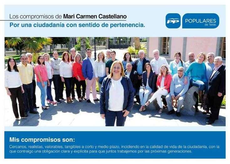 Telde.- El Partido Popular de Telde ha lanzado en las redes sociales un video resumen del acto que celebró el pasado sábado para presentar en sociedad la candidatura que encabezará Mari Carmen Castellano al Ayuntamiento de esta ciudad. El mitin popular congregó a unas 500 personas, tal y como adelantó TELDEACTUALIDAD. Los populares distribuyen también estos días un díptico con sus compromisos electorales.