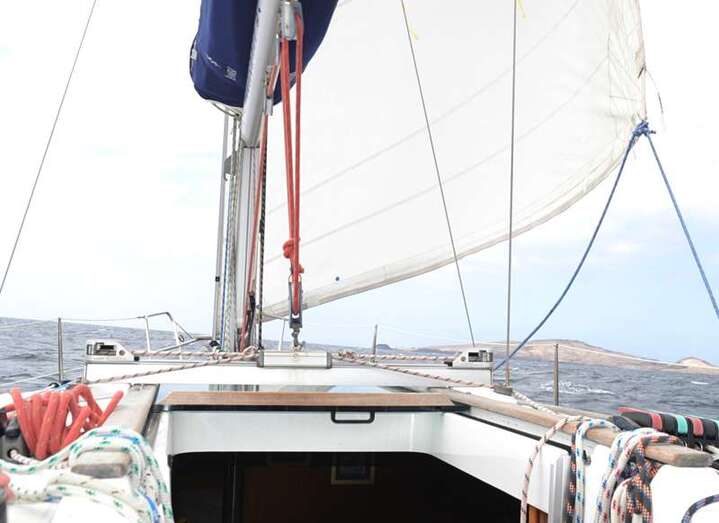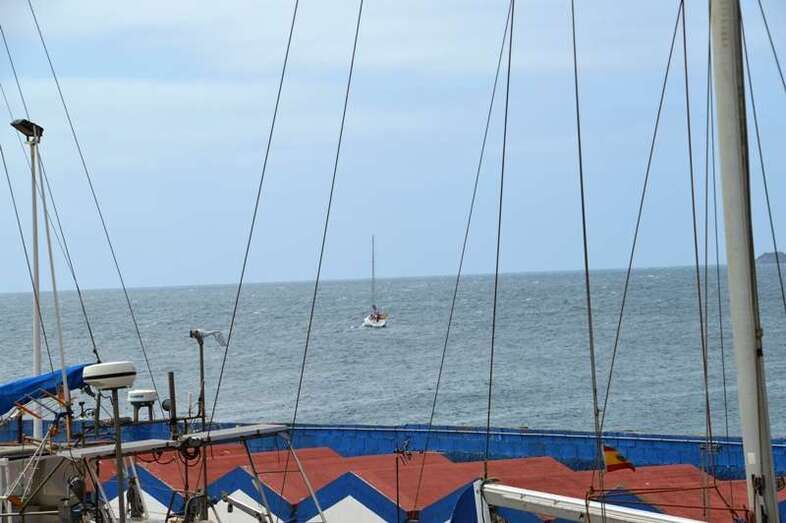 A motor y la vela mayor henchida durante buena parte de la travesía de vuelta, que se desarrolló con absoluta normalidad en un mar algo bravo que ocasionó mareo a uno de los intrépidos informadores.