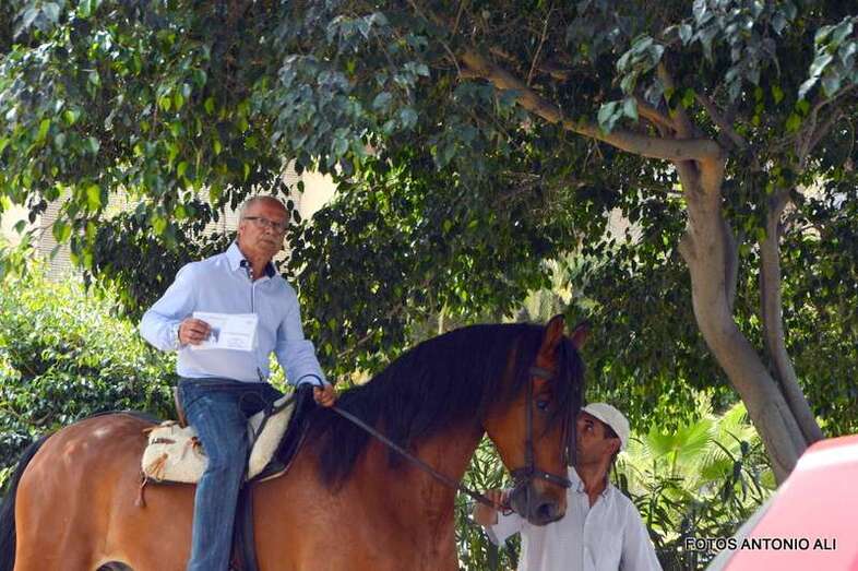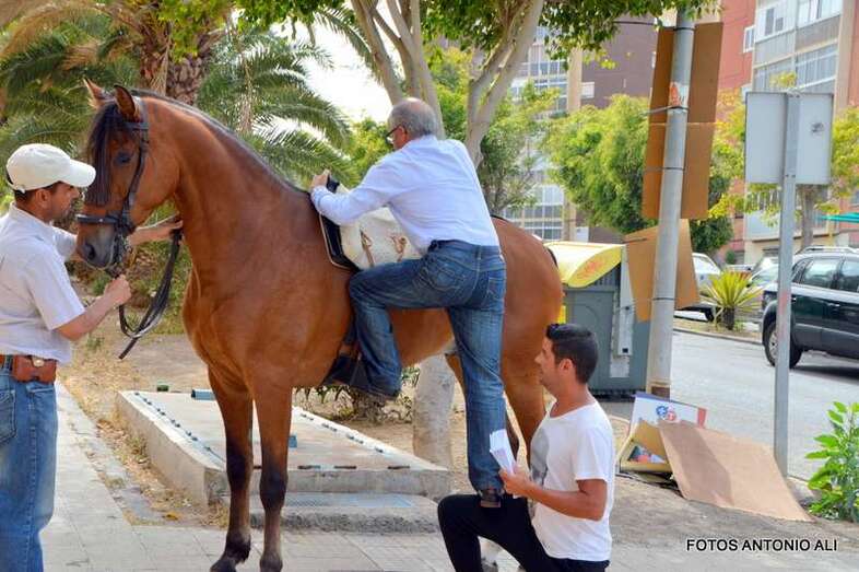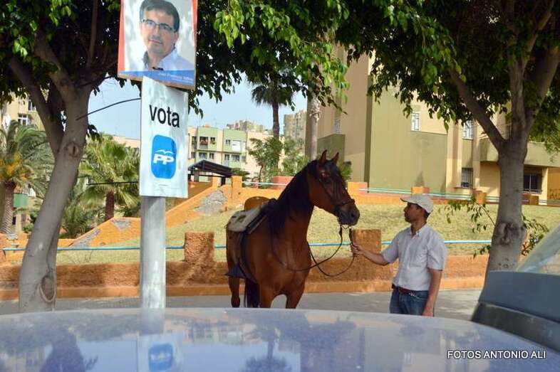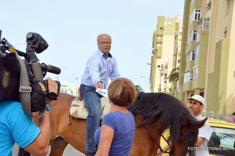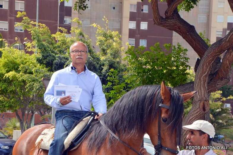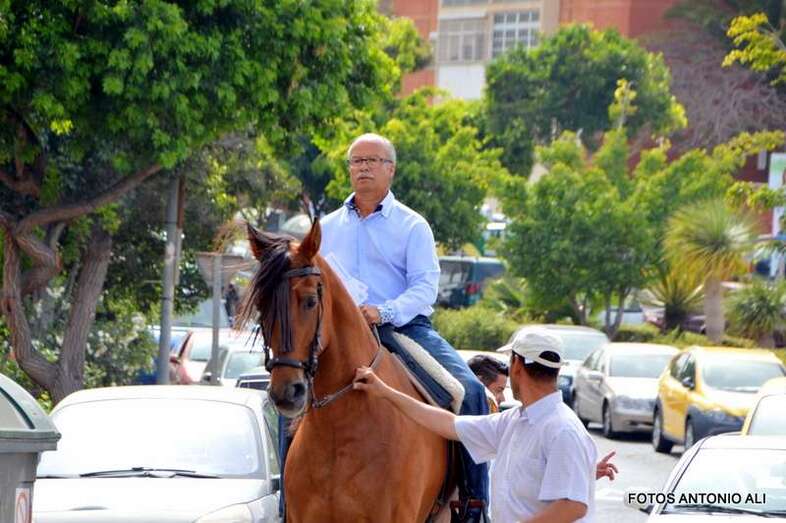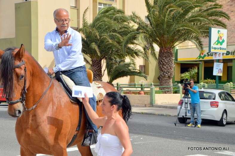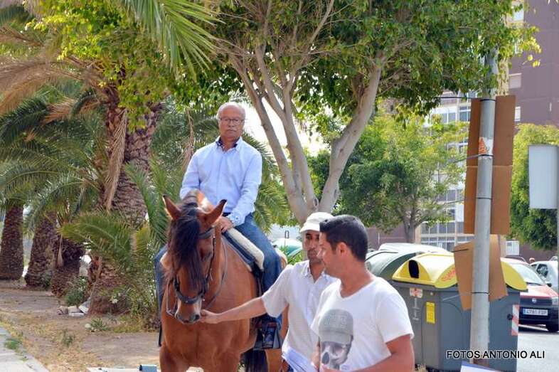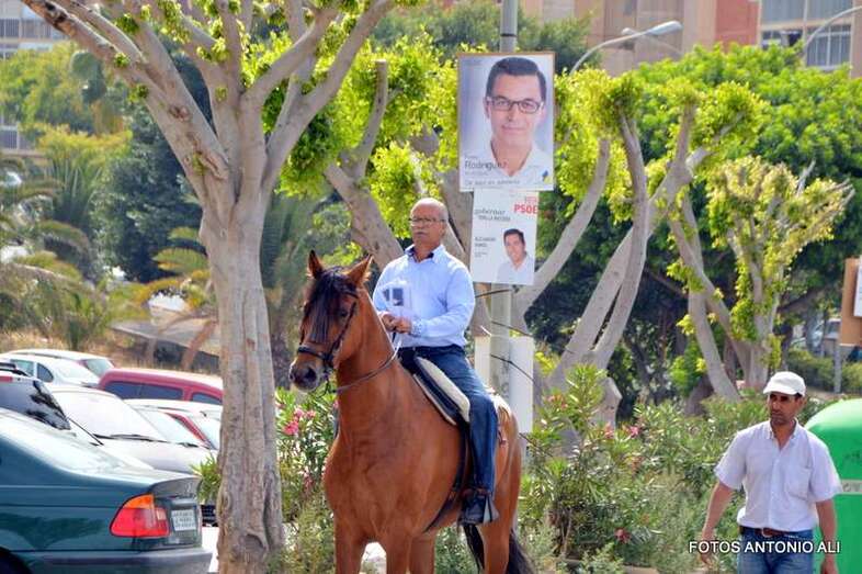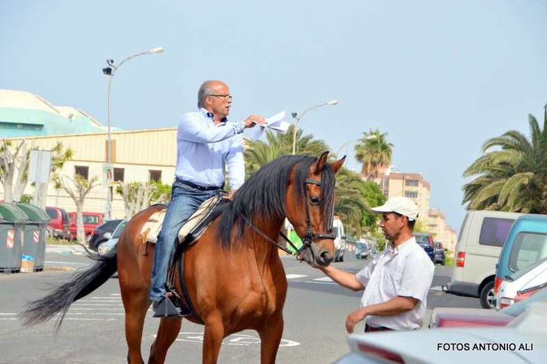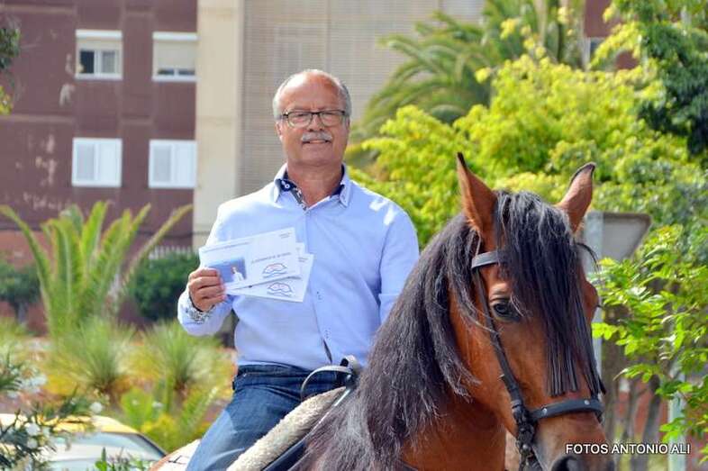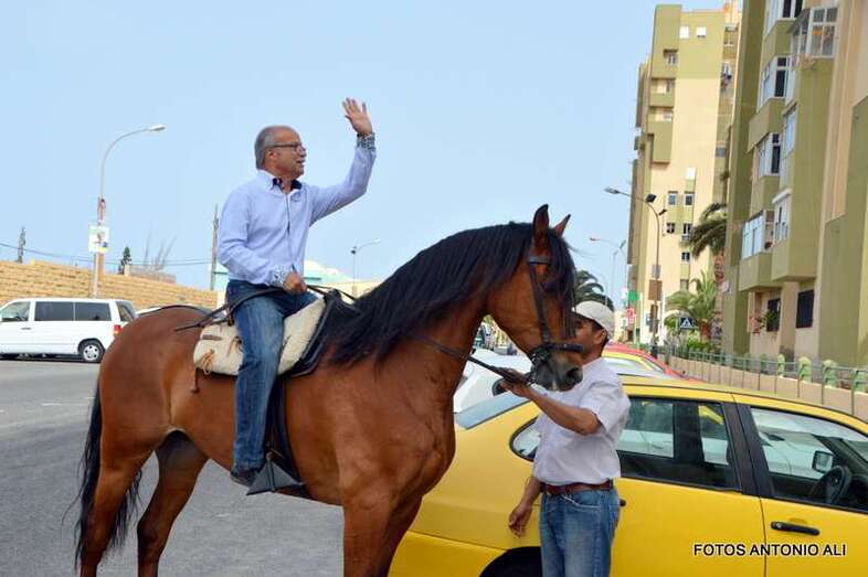 Telde.- Sebastián Henríquez, candidato por Roque de Gando a la Alcaldía de Telde, prosigue con su particular campaña electoral. Tras su llamativa irrupción en el acto de pegada de carteles y su travesía en barco hasta el roque de da nombre su partido, y después de versionar el mítico Imagine de John Lennon, hoy ha vuelto a sorprender a los teldenses subiéndose de nuevo a lomos de un caballo para repartir papeletas por el Valle de Jinamar.