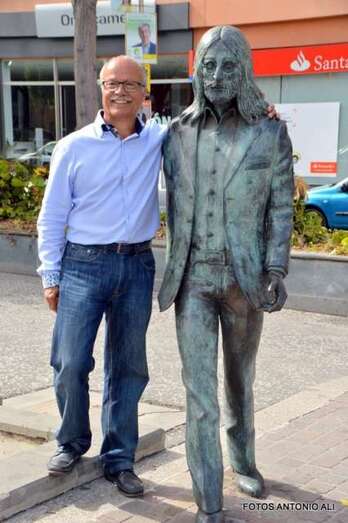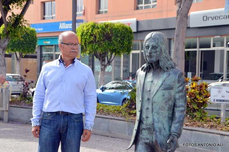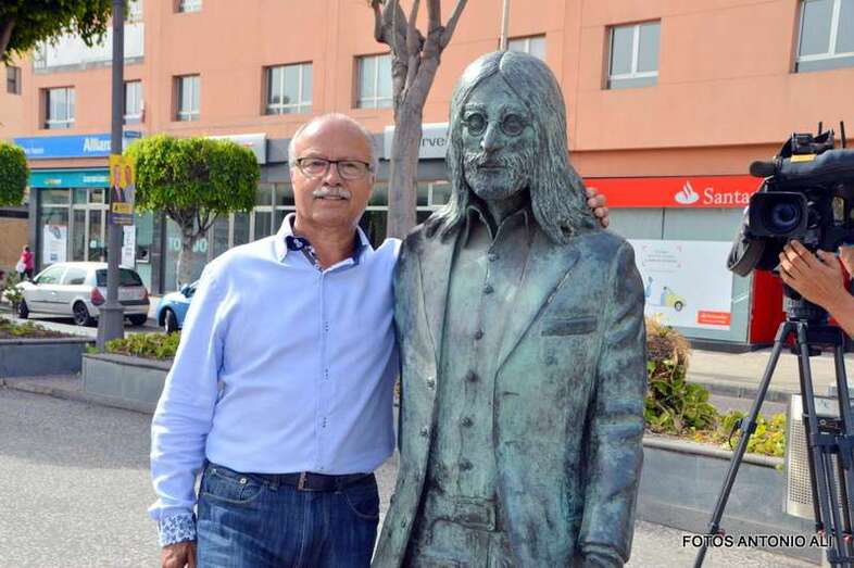 Hoy, después de estar en Jinámar, en donde las cámaras de Antena 3 Canarias lo grabaron en plena acción, se trasladó a las ramblas de Arnao para saludar a la escultura de John Lennon, artista a quien el teldense versionó su archiconocido Imagine.