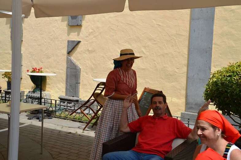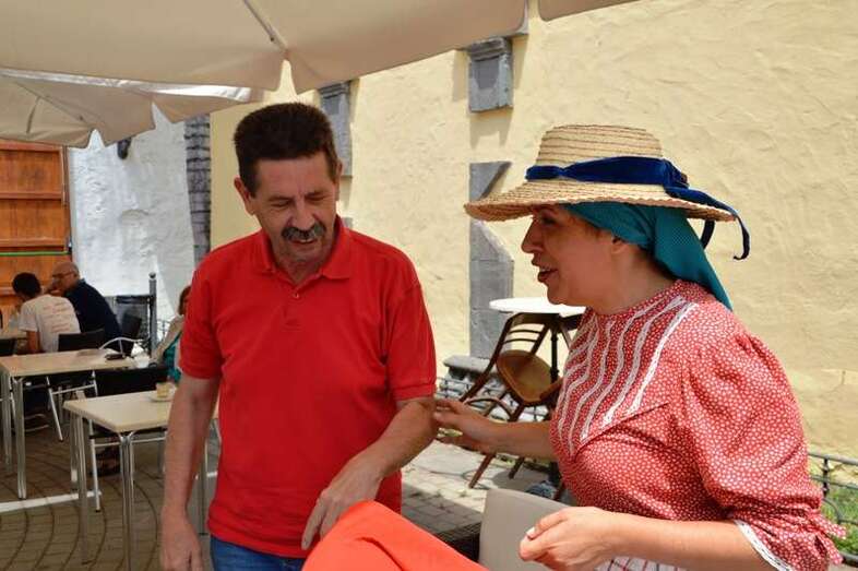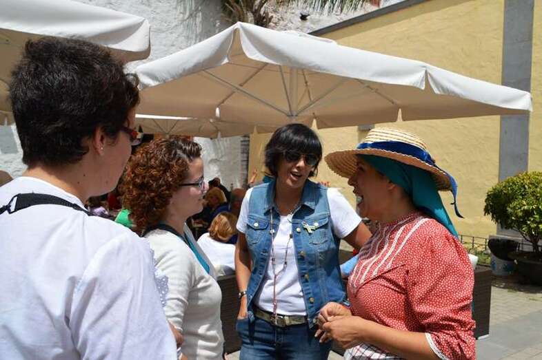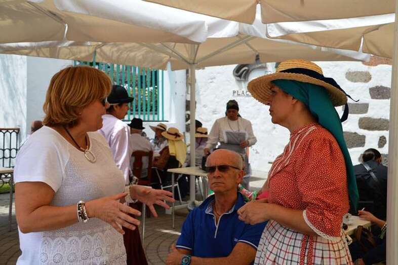 En el Rincón Plácido Fleitas, la llamada a ser primera mandataria de Telde se entretuvo hablando con las artesanas y en ese mismo espacio, ya en la terraza de El Casino de Telde,  se topó con una comitiva de miembros de Más por Telde, con los que mantuvo una afable conversación.