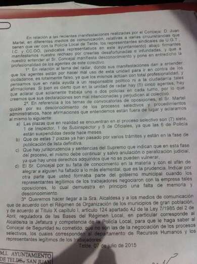 En relación a las recientes manifestaciones realizadas por el Concejal D. Juan Martel, en diferentes medios de comunicación, relativas a varias circunstancias que tienen que ver con la Policía Local de Telde, los representantes sindicales de U.G.T , I.C. y CC.OO, (sindicatos representativos en este ayuntamiento) abajo firmantes manifestamos nuestro rechazo por creerlas desafortunadas e infundadas, y que a nuestro entender el Sr. Concejal manifiesta desconocimiento y pone en entredicho la profesionalidad de los agentes de este colectivo.