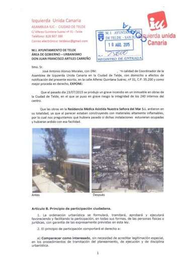 Telde.- Izquierda Unida Canaria de Telde ha solicitado a la Concejalía de Urbanismo que abra una investigación sobre las obras que se estaban ejecutando en la Residencia Mixta Asistida Nuestra Señora del Mar, en La Garita, con “materiales altamente inflamables” y que fueron pasto de las llamas en el grave incendio que afectó el pasado 23 de julio a este inmueble sociosanitario que puso en “grave riesgo” la integridad de 240 internos.