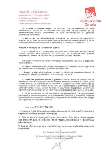 El coordinador de la Asamblea Local de IUC, José Antonio Alonso, ha pedido al área municipal que dirige el vicealcalde Juan Francisco Artiles (Más por Telde) copia del expediente urbanístico de estas obras y de los informes e inspecciones realizadas por los técnicos de su departamento.