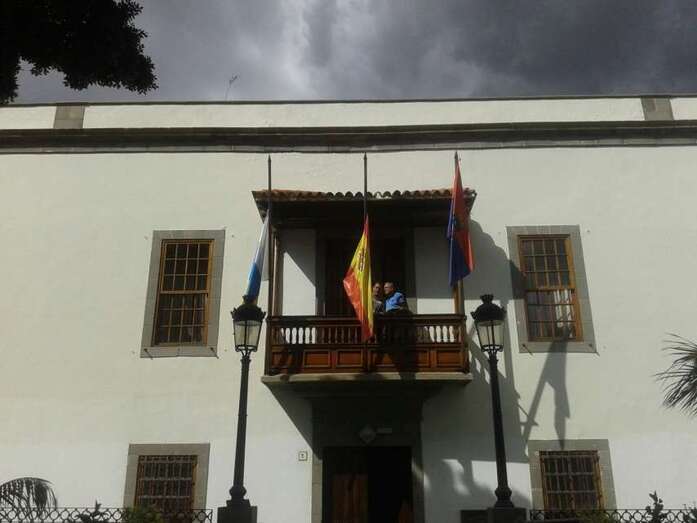 TELDEACTUALIDAD pudo confirmar que las banderas nacionales que están en las fachadas de las Casas Consistoriales y del edificio administrativo de San Juan no estuvieron a media asta hasta las 13.00 horas, una vez que la alcaldesa Carmen Hernández, tras tener conocimiento del luto oficial que determina el real decretado publicado este lunes en el BOE, se dio prisas y ordenó sobre la marcha para que se cumplimentara esta determinación.