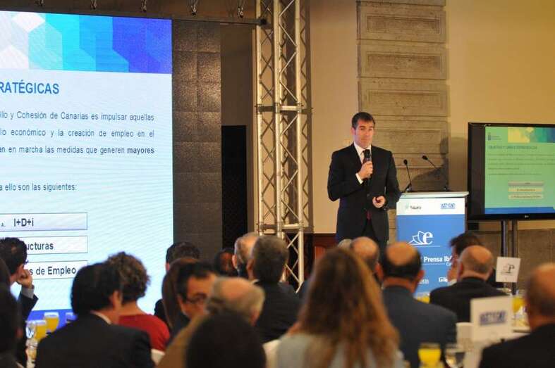 En su intervención, Clavijo emplazó a finales de 2016 a los que le llaman "ingenuo" por creer que la inversión los fondos adicionales provenientes del extinto Impuesto para el Tráfico de Mercancías (ITE) impulsarán un 0,7% el aumento del Producto Interior Bruto (PIB) de las islas para ver quién tiene razón. "Lo comprobaremos", afirmó.