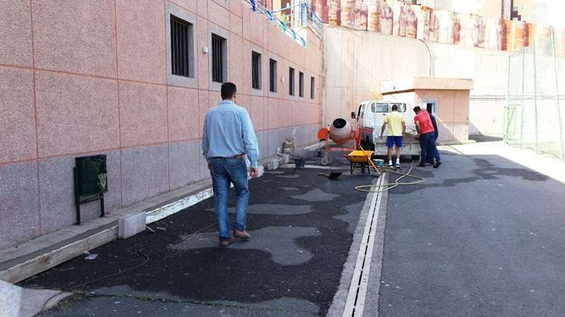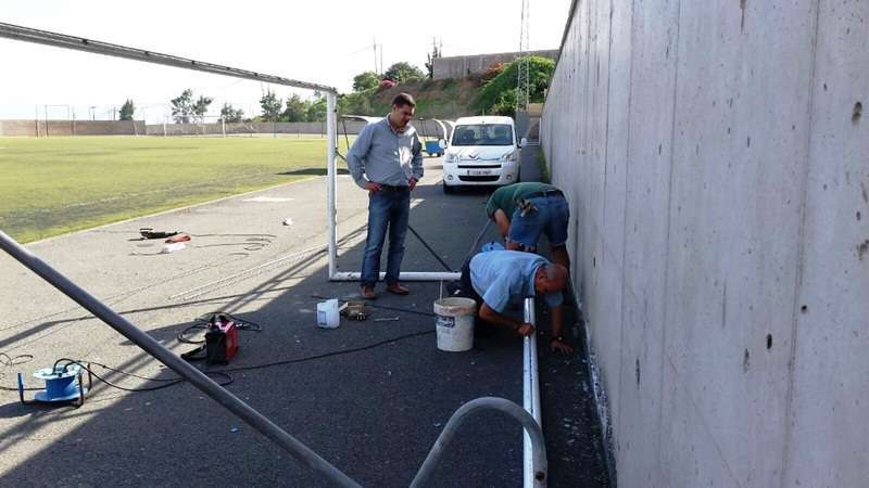 En concreto, los operarios municipales están reparando la puerta de entrada y una tubería que está siendo revestida con un contrabordillo para que quede protegida, y se están arreglando las porterías de fútbol 8, entre otras actuaciones