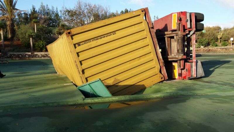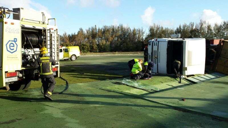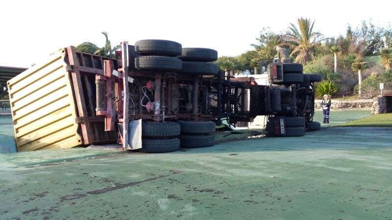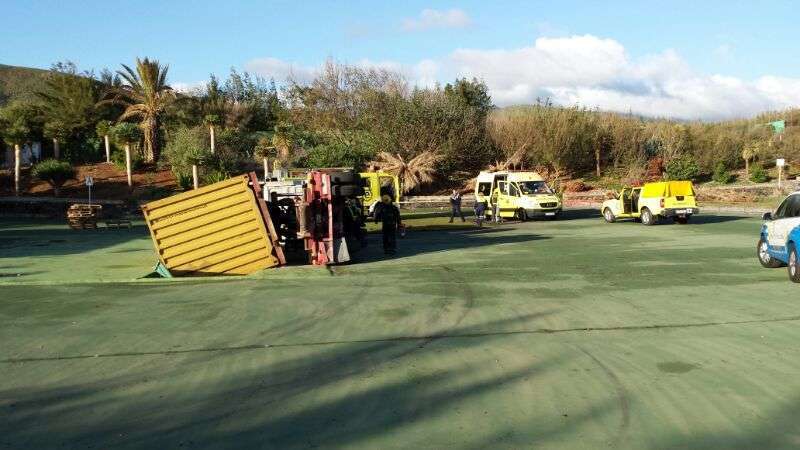 Telde.- Un camión con un contenedor acaba de volcar en las instalaciones deportivas de Lomo Pollo cuando efectuaba las operaciones de descarga de los platos para la actividad del campo insular de tiro. El conductor del vehículo, que quedó atrapaado en la cabina, ha resultado con lesiones de escasa consideración y está siendo atendido por personal de una ambulancia medicalizada del Servicio de Urgencias Canario.