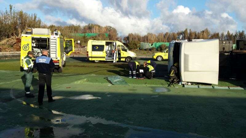El accidente se produjo hace unos minutos y hasta el lugar del suceso se han desplazado efectivos del parque zonal de bomberos de Telde para enderezar el vehículo, que quedo ladeado y cuyo conductor fue resultó ileso quejándose de dolor en la espalda que, según los primeras informaciones captadas en el lugar por este diario digital, no reviste gravedad alguna. Fue rescatado del vehículo por los bomberos tras romperse la luna de la cabina.