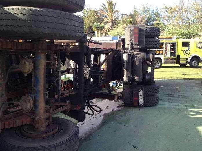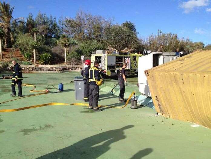 Telde.- Los bomberos del Consorcio de Emergencias de Gran Canaria, con base en el parque zonal de La Garita, en Telde, tuvieron que intervenir este viernes para trasvasar los 150 litros de gasoil que albergaban los depósitos de combustibles del camión que esta mañana volcaba en las instalaciones deportivas del Campo de Tiro de Lomo Pollo.