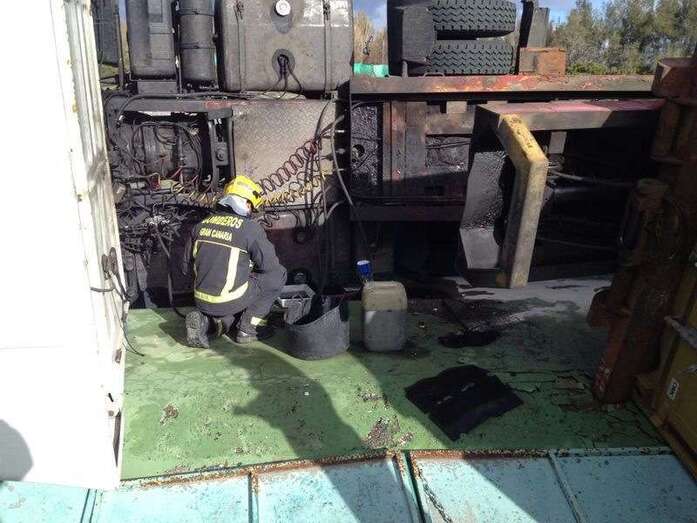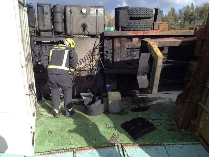 Los bomberos de Telde trasvasan 150 litros de combustible del camión accidentado en Lomo Pollo