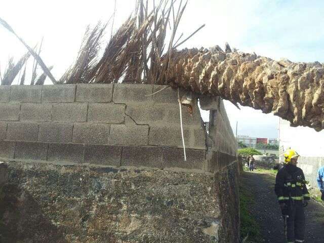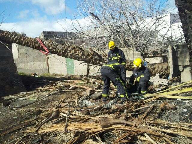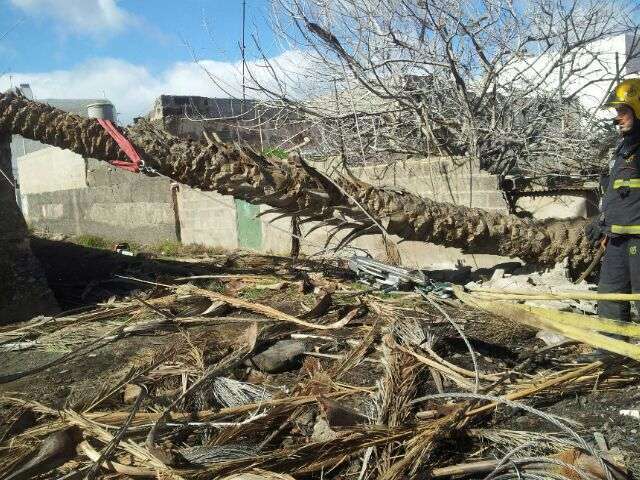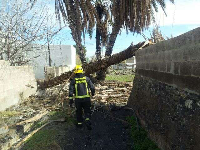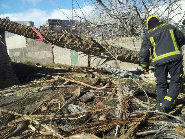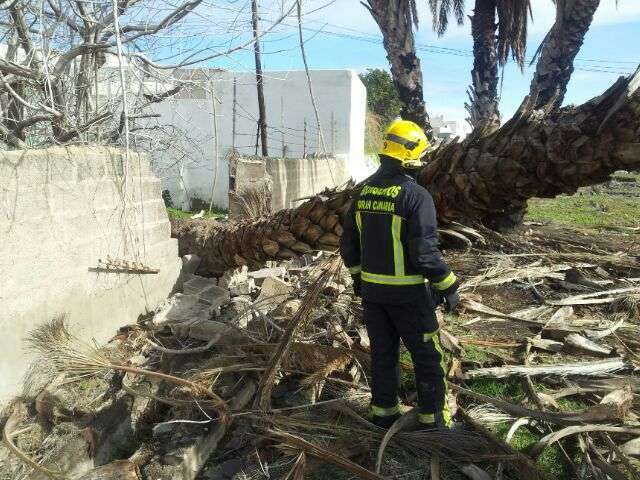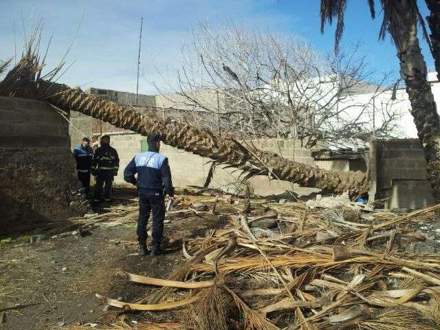 El suceso se produjo al filo de las 10.30 horas en una finca de la calle de Palacio Valdés, momento en que fue alertado el parque zonal de bomberos de Telde de la caída de la palmera sobre un muro, al que provocó daños al igual que al de un estanque de agua próximo. El viento arrancó de su base a la palmera.