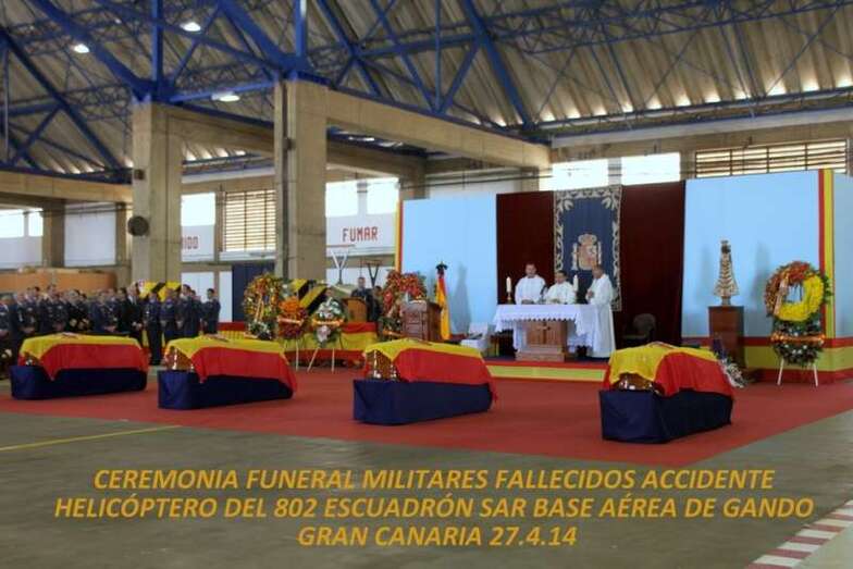 La familias y compañeros de los cuatro fallecidos en Canarias tras caer al agua un helicóptero del SAR 802 han despedido este domingo en una emotiva, solemne y sencilla ceremonia a las víctimas en un funeral con la presencia del ministro de Defensa, Pedro Morenés, y del presidente del Gobierno canario, Paulino Rivero, entre otras autoridades civiles y militares. En representación del Ayuntamiento de Telde acudió la alcaldesa Mari Carmen Castellano.