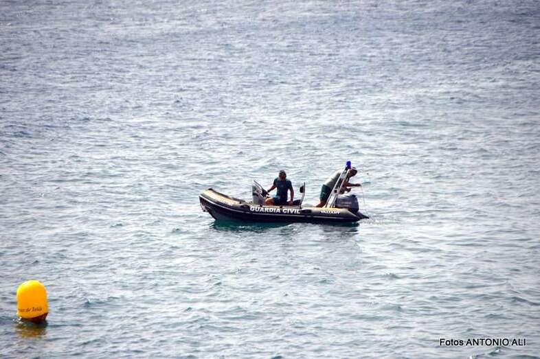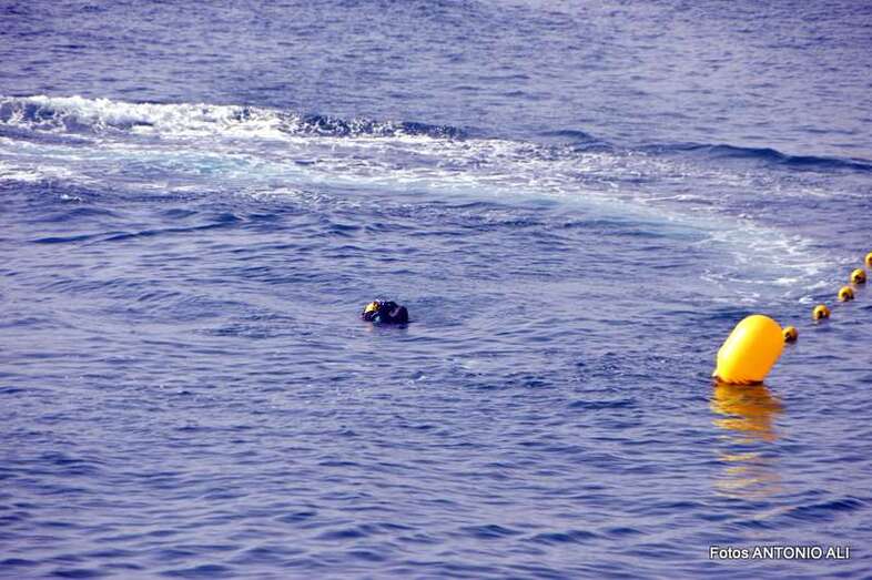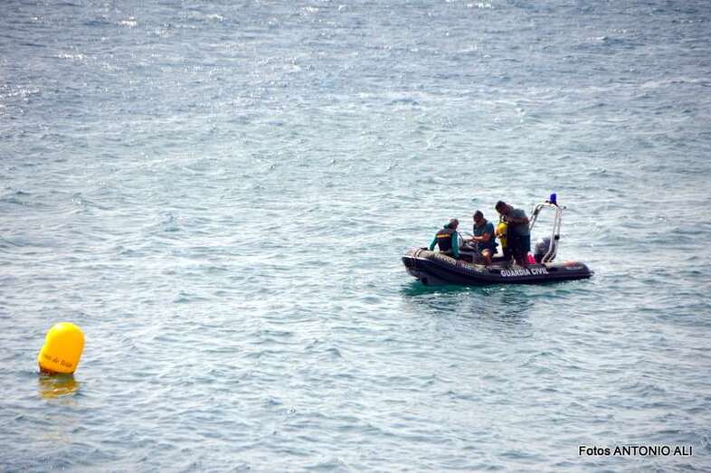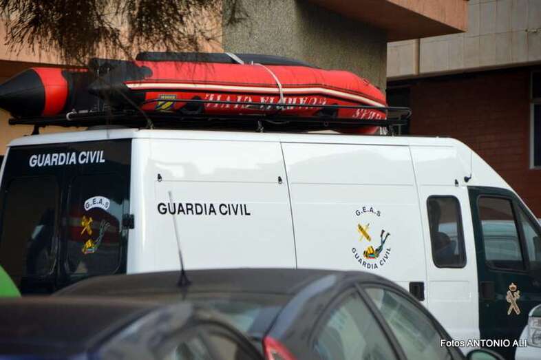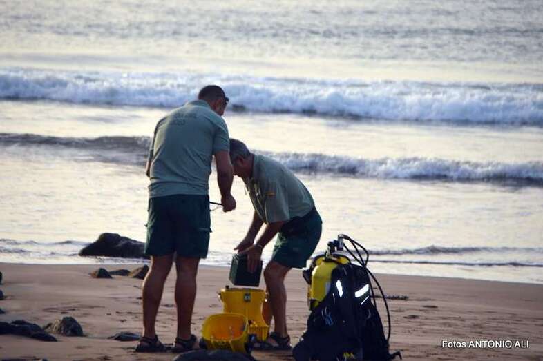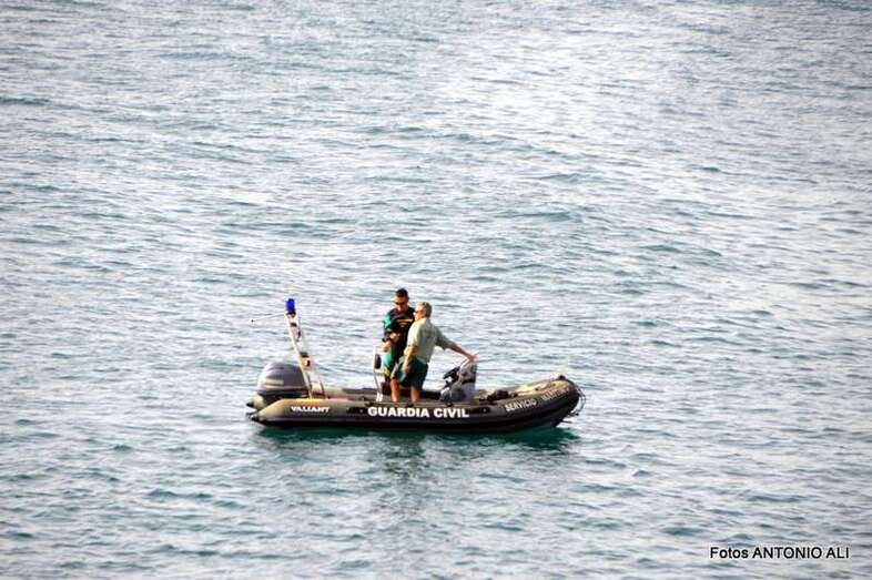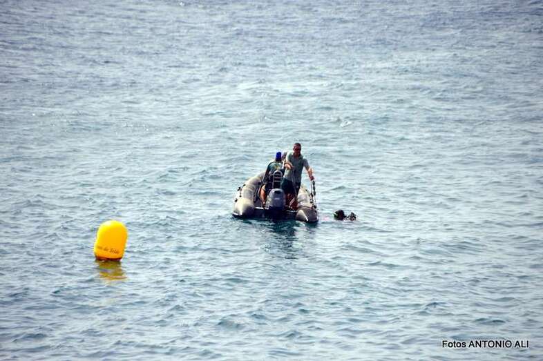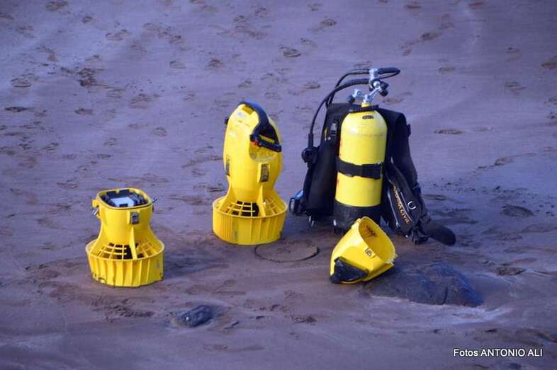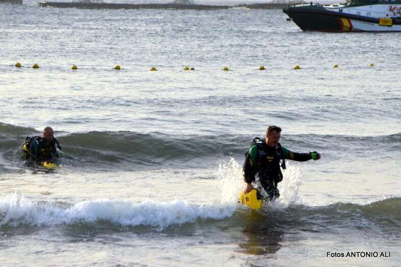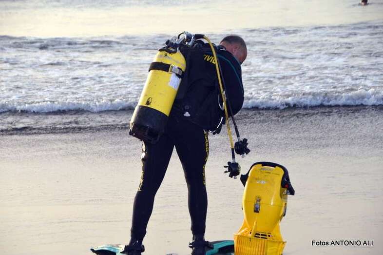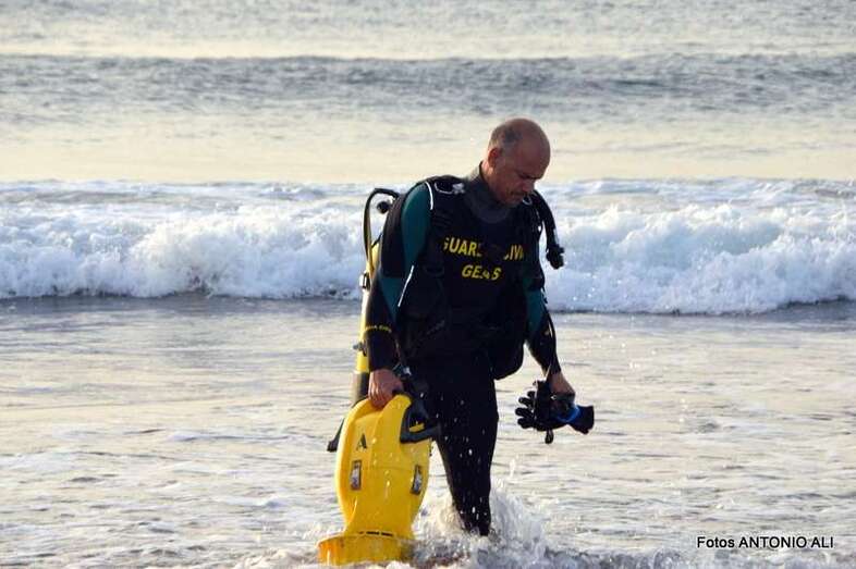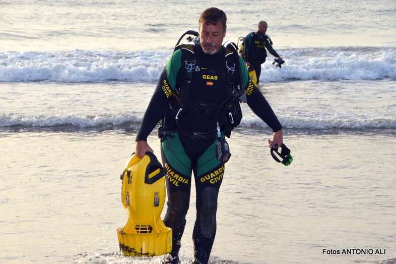 Un buzo del Grupo Especial de Actividades Subacuáticas de la Guardia Civil, regresa a la arena de Salinetas tras finalizar una inmersión (Foto Antonio Alí)