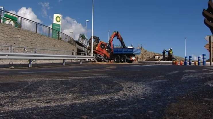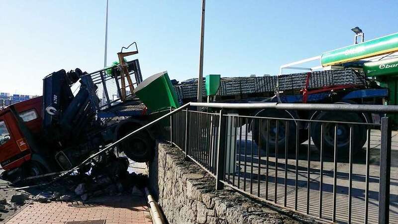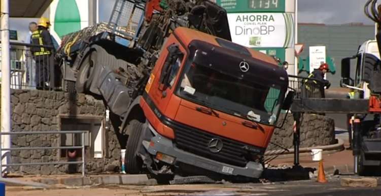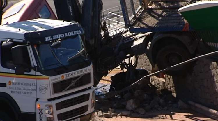 El vehículo largo, con una cabeza tractora de color rojo y una plancha cargada de pavimento, se quedó colgado tras atravesar la valla de la Estación de Servicios BP, ya que se encontraba dentro de las instalaciones, donde había repostado minutos antes. Parte del camión terminó cayendo a la acera y a la vía que da a la rotonda que regula el tráfico en la salida de Las Terrazas hacia la GC-1 y El Cortijo.
