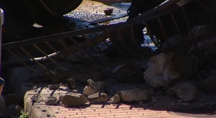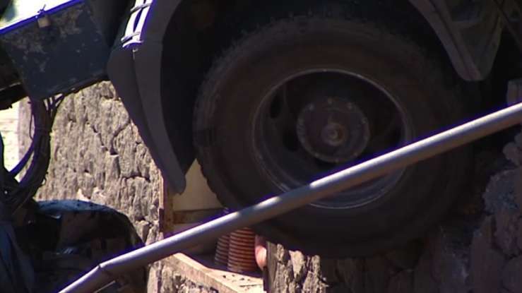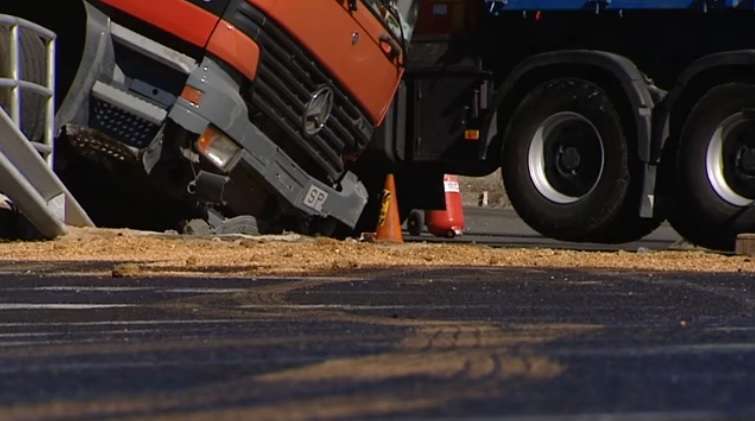 Los servicios de emergencia están a la espera de que una grúa pueda retirar el camión para recuperar la normalidad del tráfico. En esta tarea participarían luego dos grúas para desenganchar  la cabina del camión de la valla metálica y retirar la plancha con su mercancía.