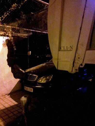 En unas maniobras, el camión del servicio de recogida de basura  impactó contra un Mercedes aparcado en la vía y también ocasionó daños a un muro. No hubo que lamentar víctimas. La Policía Local se hizo cargo de instruir las diligencias oportunas.