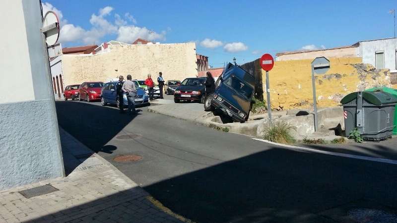 La mujer salía de un pequeño solar de tierra (majano) donde suelen aparcar coches y por motivos que aún se desconocen terminó con las ruedas en la cantonera, sin poder sacarlas y con el coche inclinado.