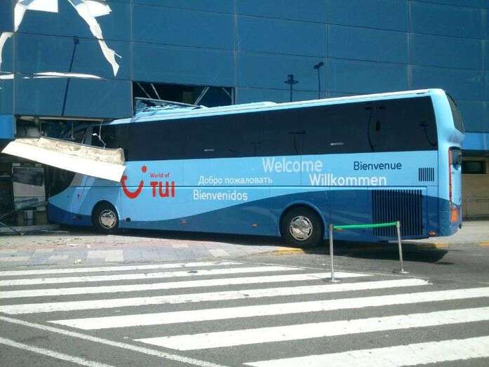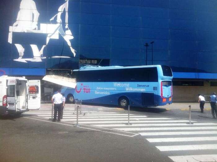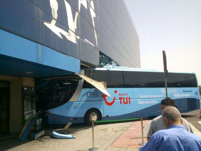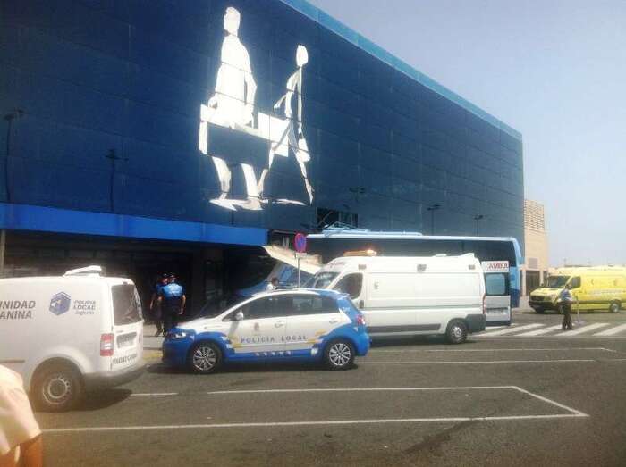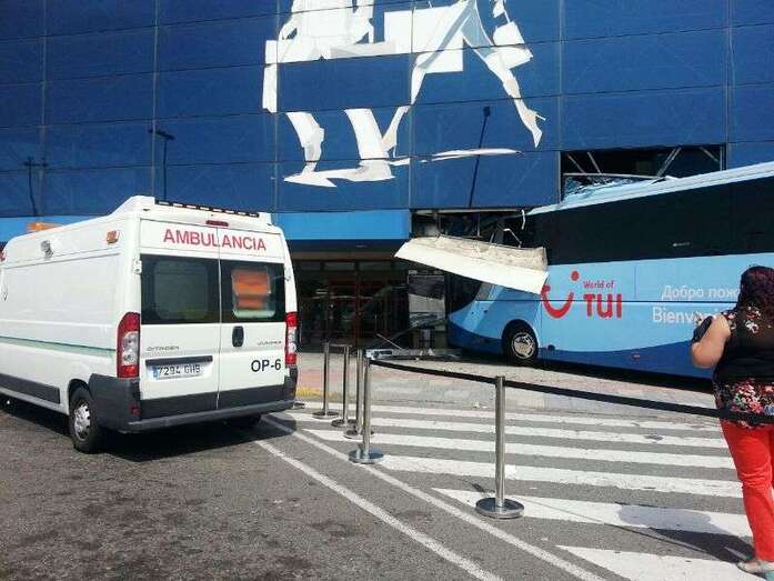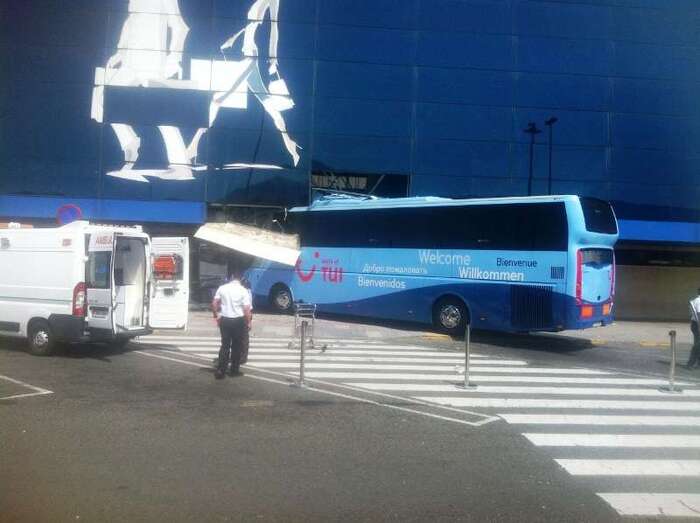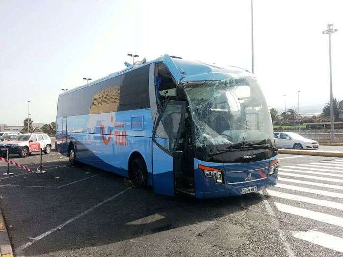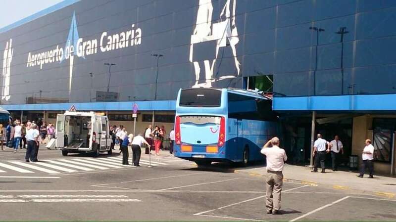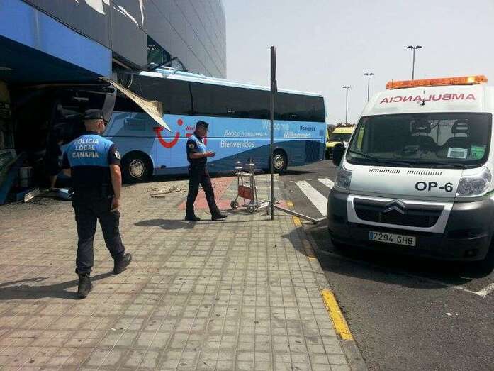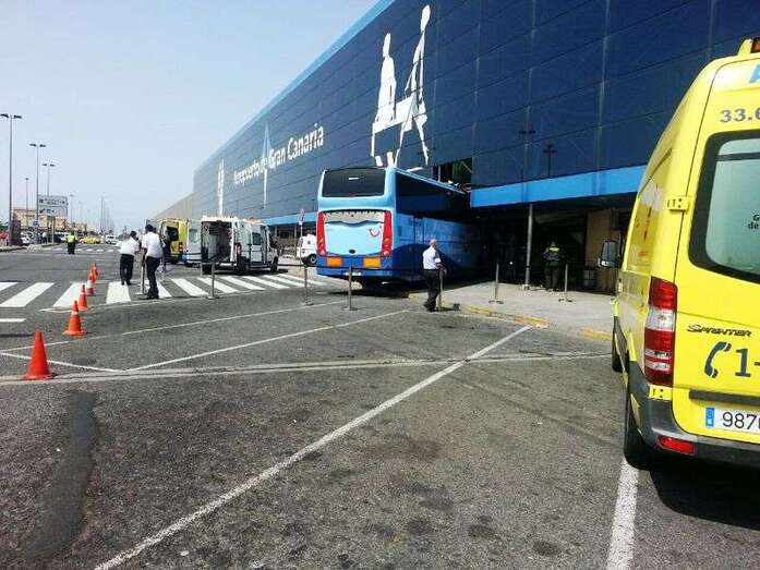 El autocar de color azul por un despiste de su conductor embistió contra la puerta de entrada al edificio Sur del aeropuerto y arrolló a un turista extranjero (alemán) de 81 años, que sufrió heridas leves (corte profundo) en un brazo de las que fue atendido por el personal sanitario de una ambulancia medicalizada del Servicio de Urgencias Canario, que envió también al accidente una unidad móvil de soporte vital básico. Fue evacuado al Hospital Universitario Insular de Gran Canaria, ya que, según los testimonios recogidos en el lugar del suceso, aunque su estado no reviste peligro alguno sí que tendrá que ser intervenido para curarle las lesiones. Otros heridos fueron asistidos por el servicio médico del aeropuerto.