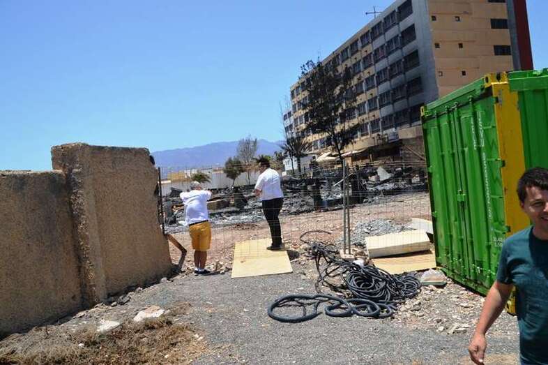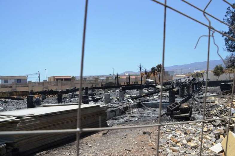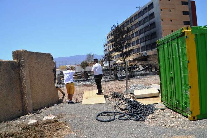 Según informa la Televisión Canaria, los peritos de la compañía de seguros evalúan los daños causados por las llamas, mientras que varios operarios continúan refrescando la zona del fuego.
