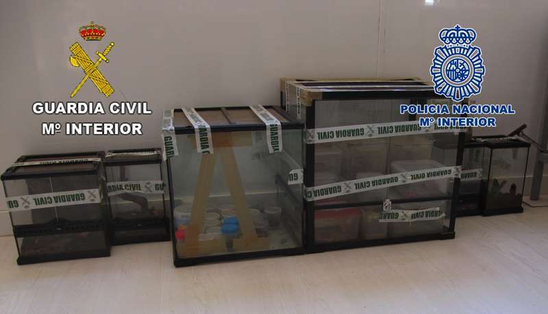 Asimismo, en el registro domiciliario aprehendieron un total de 72 plantas de marihuana de diferentes tamaños, 800 gramos de cogollos y diversos sistemas de iluminación y refrigeración para su cultivo y elaboración (equipos de calor, ventiladores, abonos específicos, etc...). También se encontraron diferentes terrarios conteniendo en su interior 31 escorpiones de diferentes especies, motivo por el que se solicitó colaboración de los componentes del Seprona la Guardia Civil.