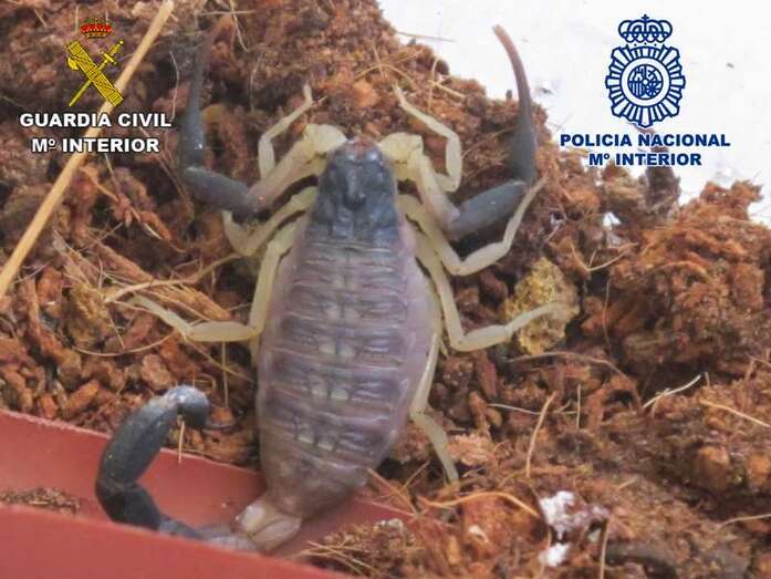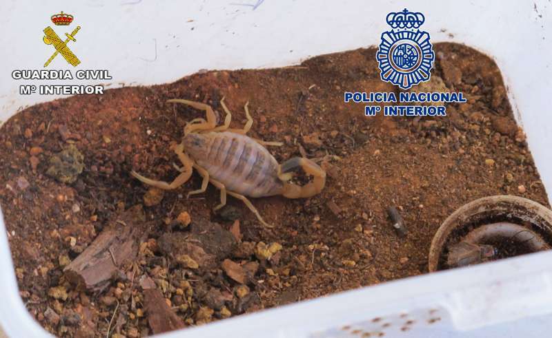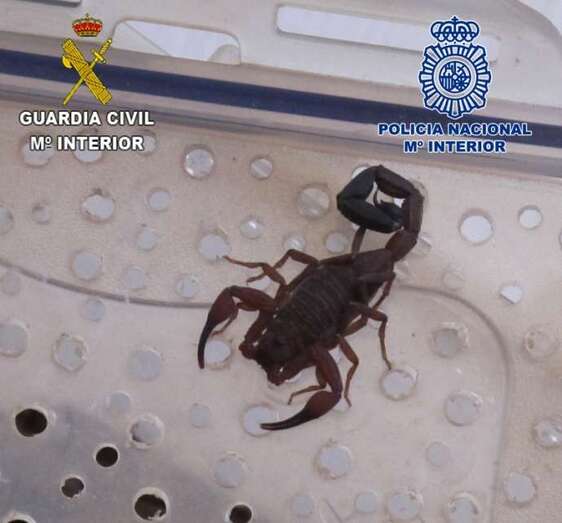 - 3 ejemplares de escorpión de la especie Leirus quinquestriatus, procede de África y Oriente Medio y considerados como muy peligrosos.