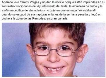 Aunque en la nota policial no se hace referencia expresa a la persona detenida y luego libertada, TA ha podido saber que se trata de Loly Rivas Losada que llegó a comentar en su perfil personal de facebook que "aparece vivo Yéremi Vargas y no dan la noticia porque están implicadas en su secuestro funcionarias del Ayuntamiento de Telde, la alcaldesa de Telde, la ex farmacéutica de Vecindario y no quieren que se sepa. Yo estaba alló cuando se escapó de sus raptoras el lunes de la semana pasada y llegó en coche a la zona de las Remudas, en Gran Canaria".