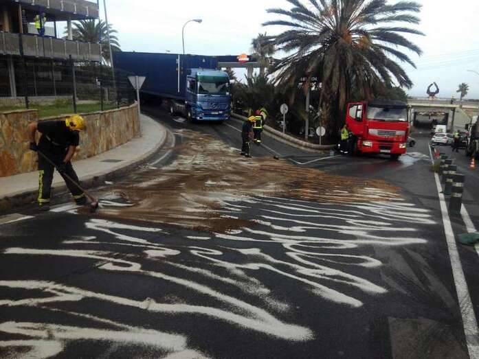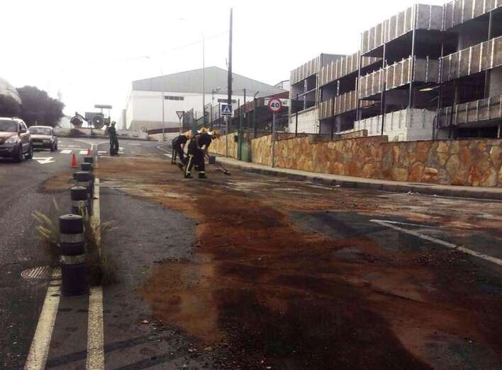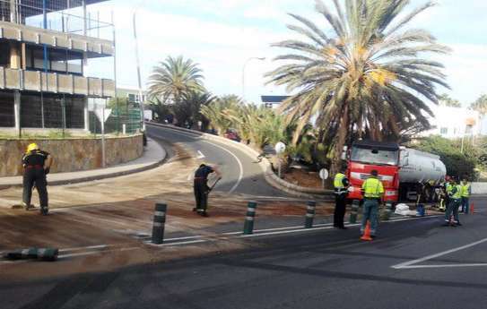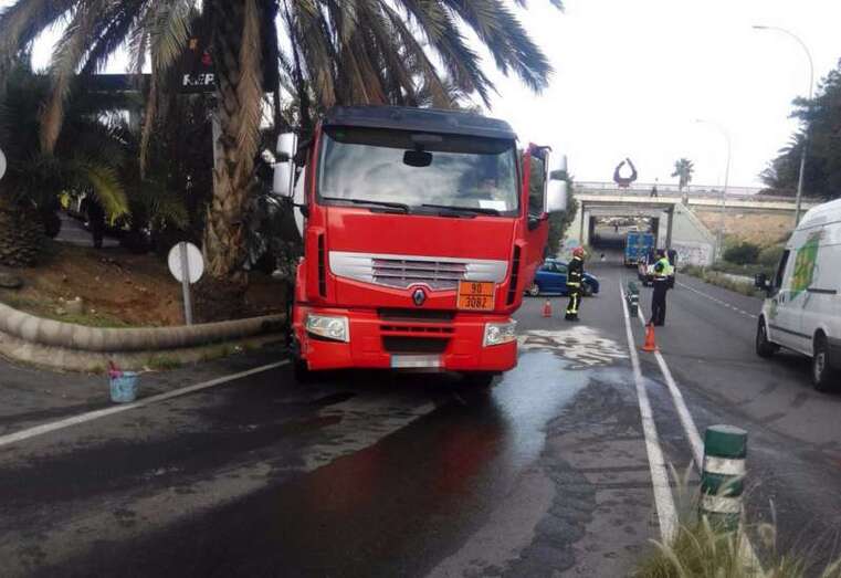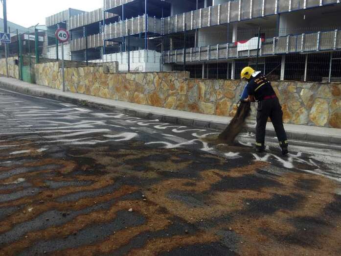 Allí, en la calle Bosque, paró el conductor. Vía cuyo carril de subida fue cortado al tráfico para facilitar las tareas de los recursos de emergencia que tuvieron que actuar: Policía Local de Telde y Guardia Civil, así como el Consorcio de Emergencias, que desplazó dos dotaciones de bomberos que junto a los operarios del servicio de conservación de carreteras del Cabildo se encargaron de neutralizar con sepiolita y limpiar las vías afectadas por el mismo.