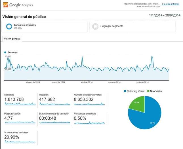 En los seis primeros meses del año en curso, este diario digital contabilizó 8.653.302 páginas vistas, un 27,35% más que en el mismo periodo de 2013. En cuanto a las visitas, el incremento porcentual fue de un 2,78%, ya que se pasó de 1,7 a 1,8 millones, lo que supone un promedio de 4,77 páginas vistas por visita, frente al 3,85 del primer semestre de 2013.