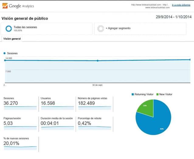 Los registros estadísticos de Google Analytics, que certifica los datos, detallan que TELDEACTUALIDAD recibió entre el lunes y el miércoles de esta semana exactamente 36.270 visitas, desde 16.598 ordenadores distintos (visitantes exclusivos) que tuvieron conectados a este diario digital durante más de cuatro minutos durante cada acceso. Este apunte estadístico indica que la media diaria de visitas reales fue de 12.090.