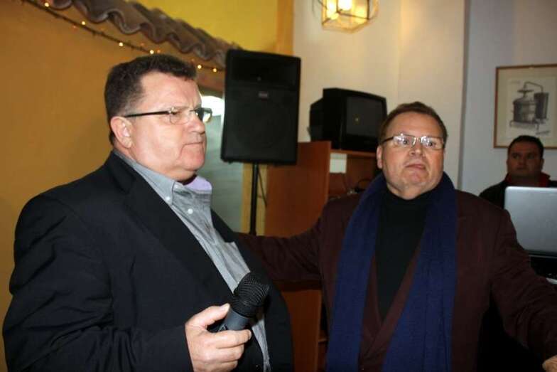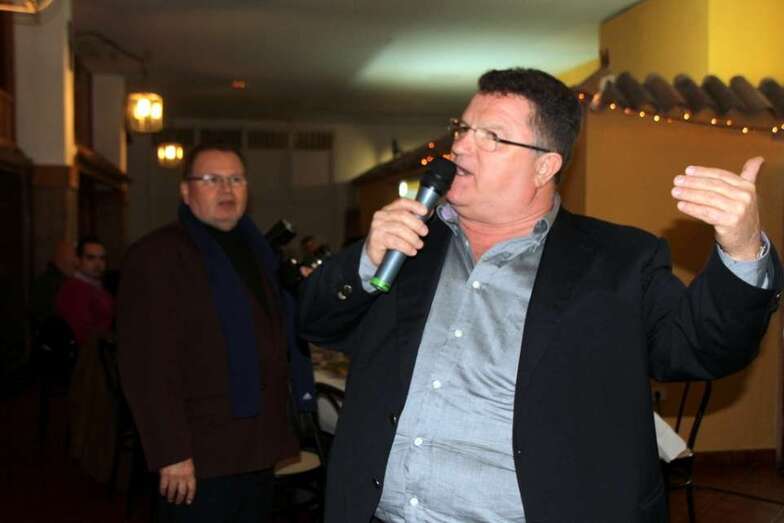 “Buenas noches, bienvenidos un año más al encuentro anual de la Orden de los Inocentes. Para empezar tenemos con nosotros a un cantante de primera línea, que nos va a deleitar con sus canciones, se llama D. Agustín Navarro y el DJ, encargado de la acústica y megafonía, Nacho González, ambos presentes en este acto por cortesía de Teldeenfiestas.com, dirigido por D. Agustín Cabrera. Muchas gracias a teldeenfiestas por su colaboración a la Orden de la Amistad, la Solidaridad y la Pluralidad. Comenzará su actuación con varias interpretaciones mientras degustamos los platos servidos en la cena y hablando bajito escuchamos esta prodigiosa voz. Sin ir más lejos les dejo con Agustín Navarro”