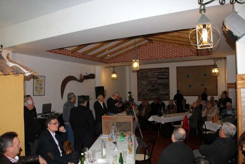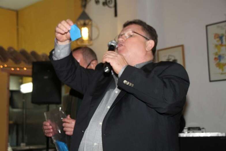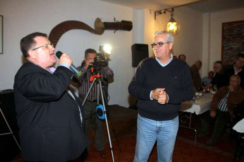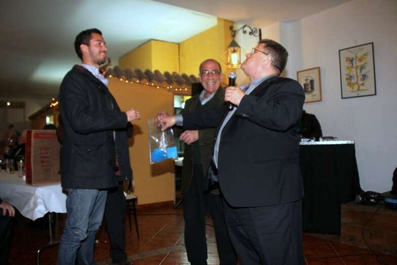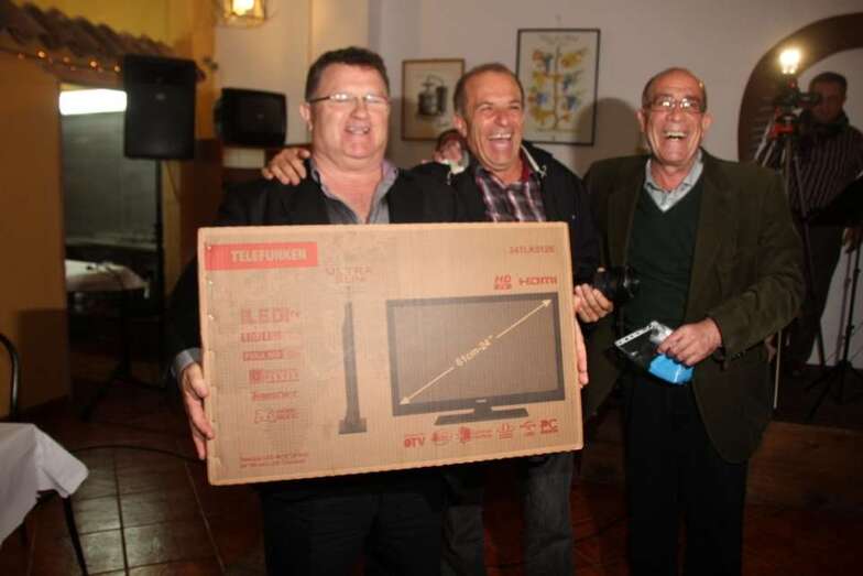 Celebramos hoy nuestros primeros 20 años, en este tiempo hemos colaborado con diversas instituciones y ONG. Este año en que persiste la situación de crisis económica proponemos dedicar la aportación a Cáritas, y concretamente a Cáritas de San Juan. Para contribuir a la recaudación de fondos como en años anteriores, un empresario anónimo, ya jubilado aporta un regalo, en este caso el televisor que ya mencioné antes, un Telefunken Led 24’’, para sortear entre los asistentes, con la papeleta de color azul con un número que rifaremos al final, y que aquí tenemos preparada la matriz de los talonarios, y a quién le toque, que lo disfrute como a Jesús Ruiz aquí presente, que le tocó una vinoteca en un pasado sorteo, hace un par de años.