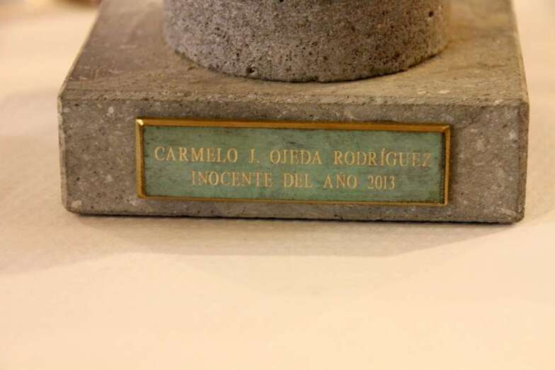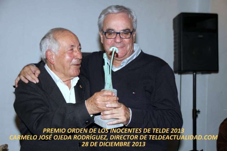 Por lo tanto, por todo esto, por mucho más, y por el reconocimiento que la Sociedad teldense le tienen con el cariño demostrado hacia su persona, la Orden de los Inocentes de Telde se complace en otorgar la Distinción de Orden de los Inocentes del Año 2013, en su XIX edición al prestigioso, profesional, gran persona y amigo, D. Carmelo José Ojeda Rodríguez. Se solicita la presencia del Inocente del Año 2012, D. Emilio Monzón y D. Máximo Riol, para realizar la entrega de los galardones. También la presencia de D. Sebastián Calderín Ruiz que va a hacer la entrega del pin de la Orden de los Inocentes a D. Carmelo Ojeda.