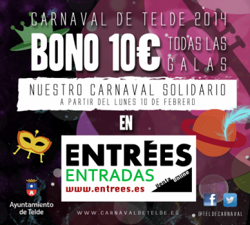 Telde.- La Concejalía de Festejos del Ayuntamiento de Telde ya ha iniciado la venta de entradas de las galas del Carnaval 2014, Un universo de diversión. Los tickets para asistir al espectáculo galáctico de la elección de la Reina y Drag Queen y al show infantil se podrán adquirir a precios populares través de Entrées Entradas o bien en las taquillas del Auditorio José Vélez del parque urbano de San Juan.