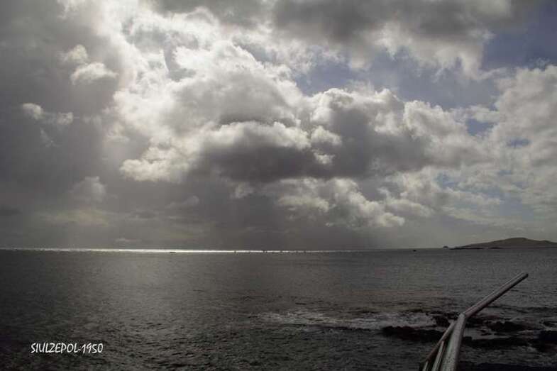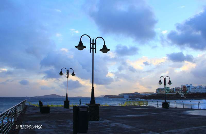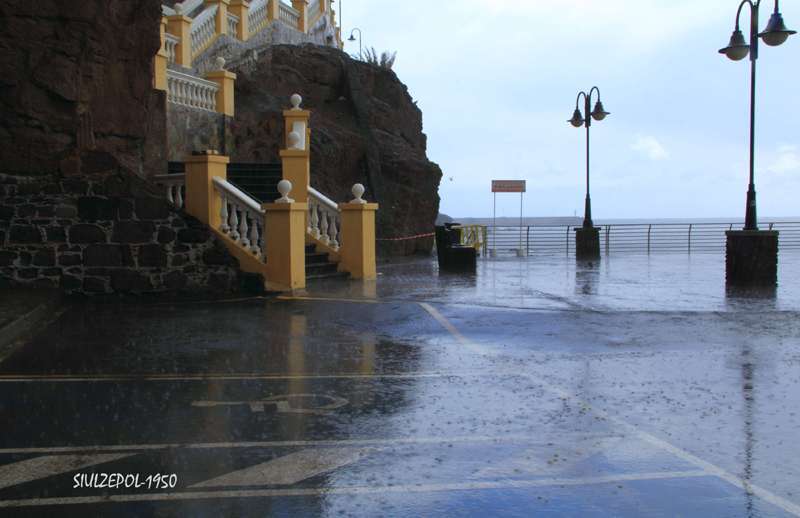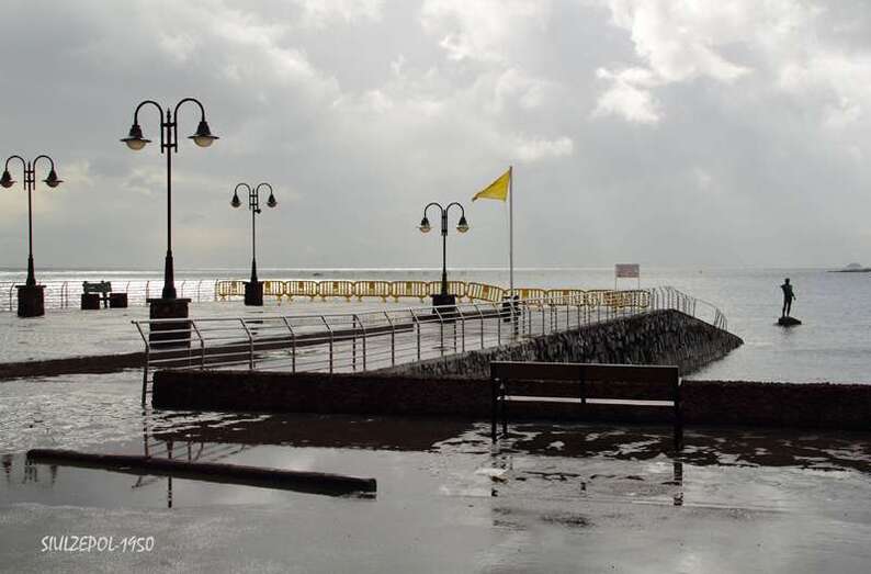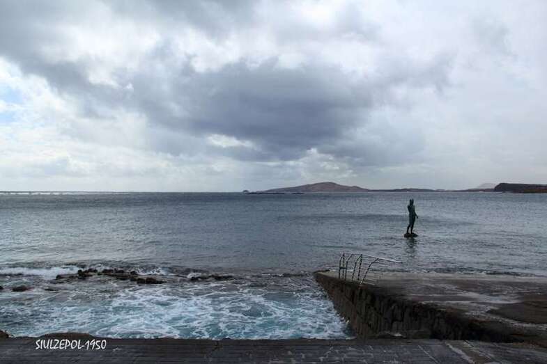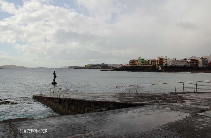 Me pasee por el muelle bajo la llovizna que caía y mi vista fue a dar frontalmente con el lamentable aspecto que sigue ofreciendo la escultura de Neptuno, obra del artista teldense Luis Arencibia Betancor y que lleva ya varios años con un brazo amputado por una marejada.