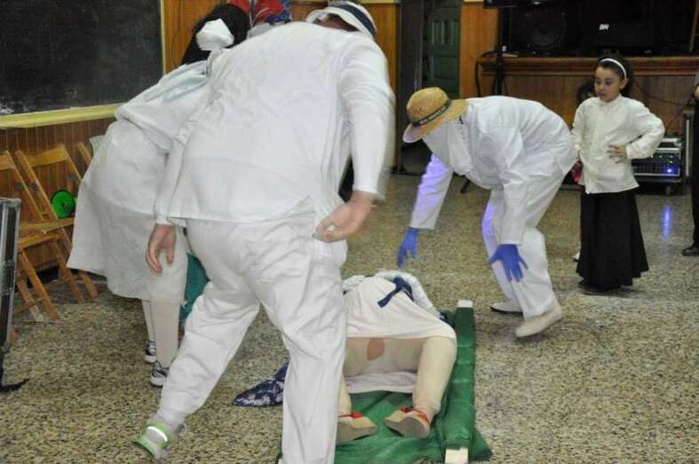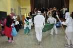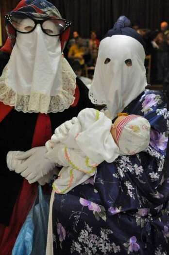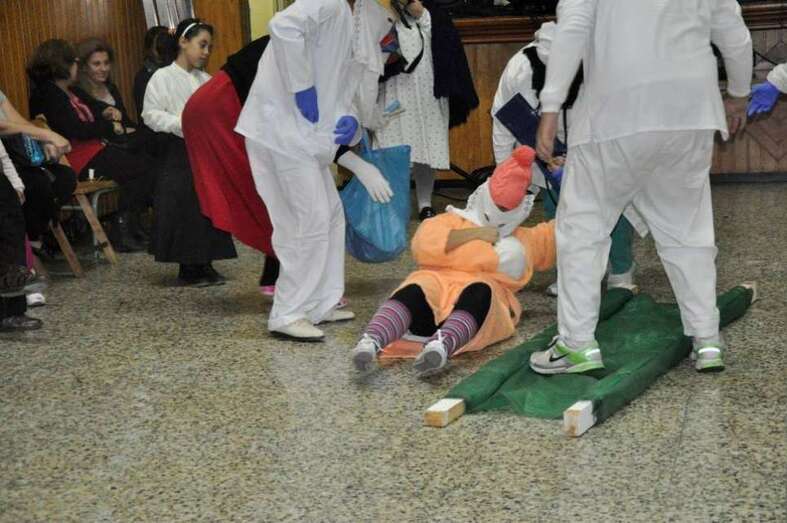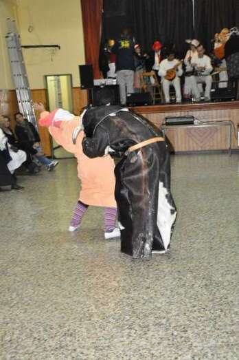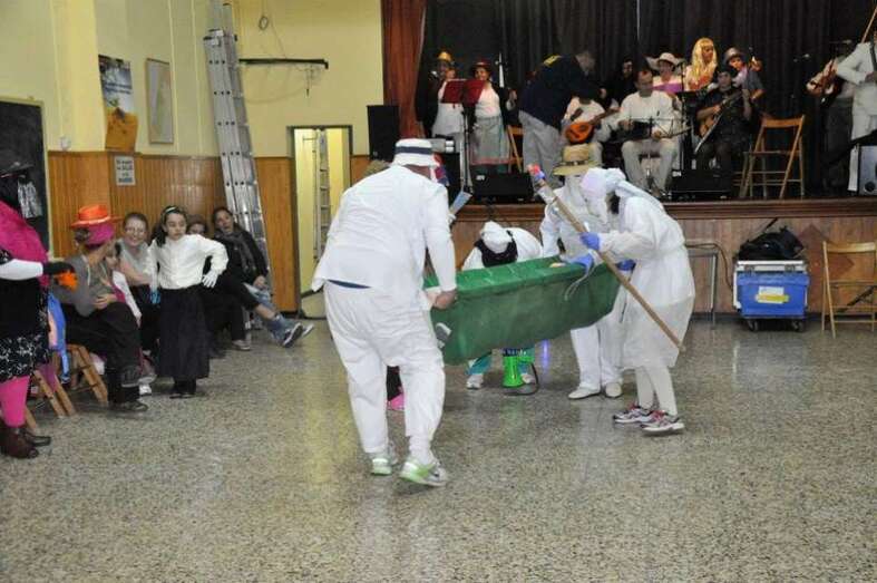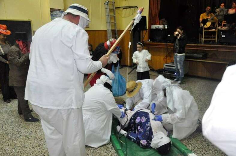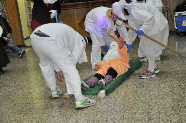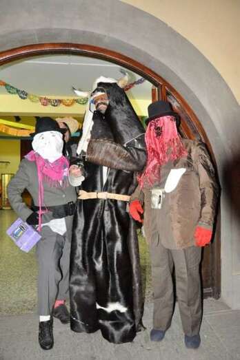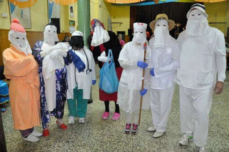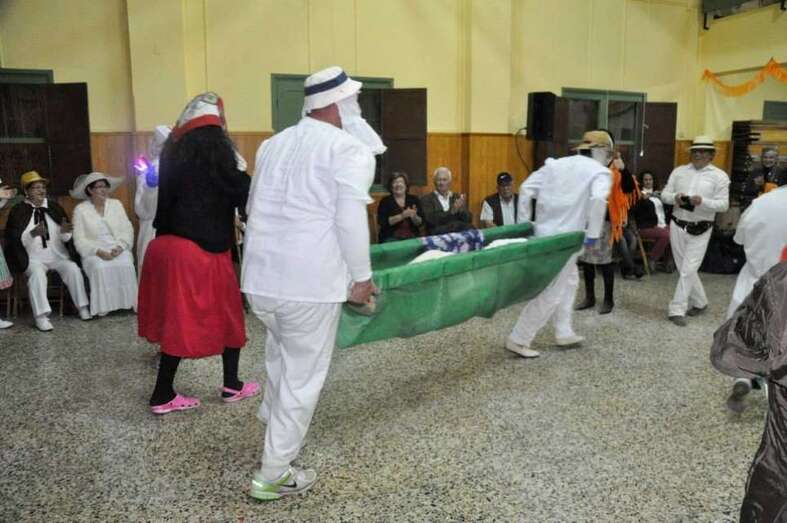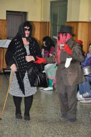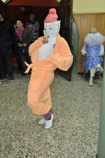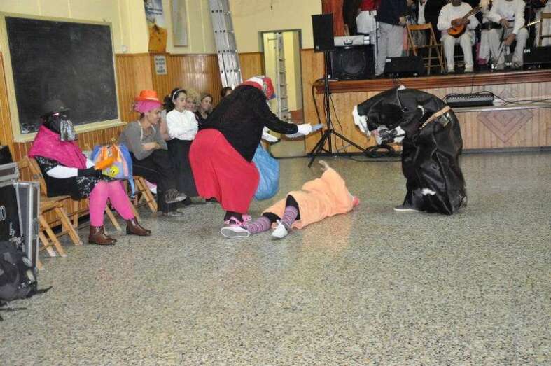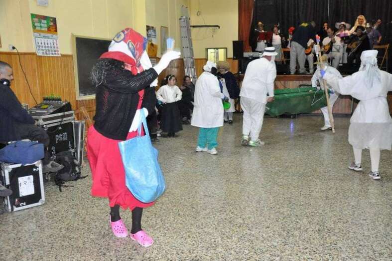 Los vecinos disfrutaron de una velada divertida al estilo tradicional con la presencia de muchas máscaras. Un grupo ataviado con ropas de sanitarios hizo pasar un rato alegre a los asistentes con sus puestas en escena. Primero, asistieron a un mujer que dio a luz en medio de la sala a un niño precioso y luego atendieron a una de las máscaras que fue atacada por La Vaca del Carnaval.